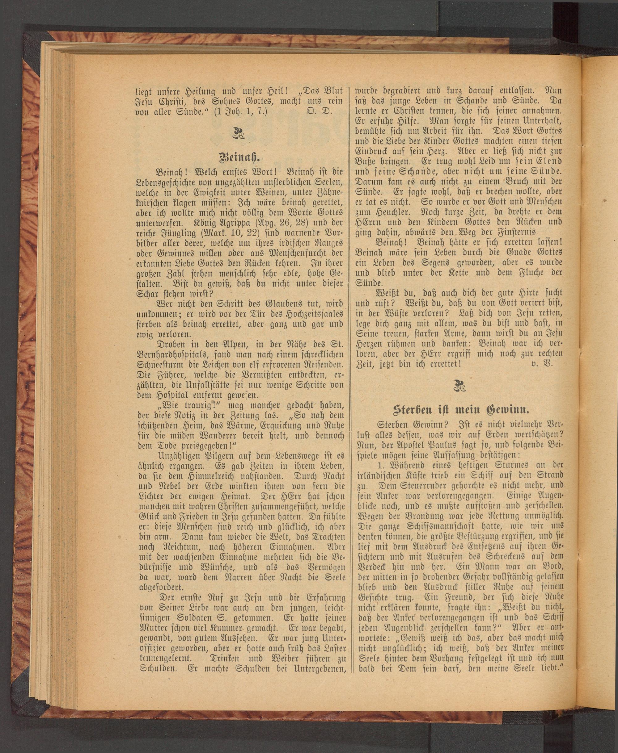 Beinah I Welch ernstes Wort! Beinah ist die Lebensgeschichte von ungezählten unsterblichen Seelen, welche in der Ewigkeit unter Weinen, unter Zähneknirschen klagen müssen: Ich wäre beinah gerettet, aber ich wollte mich nicht völlig dem Worte Gottes unterwerfen. König Agrippa (Apg. 26, 28) und der reiche Jüngling (Mark. 10, 22) sind warnende Vorbilder aller derer, welche um ihres irdischen Ranges oder Gewinnes willen oder aus Menschenfurcht der erkannten Liebe Gottes den Rücken kehren. In ihrer großen Zahl stehen menschlich sehr edle, hohe Gestalten. Bist du gewiß, daß du nicht unter dieser Schar stehen wirst?