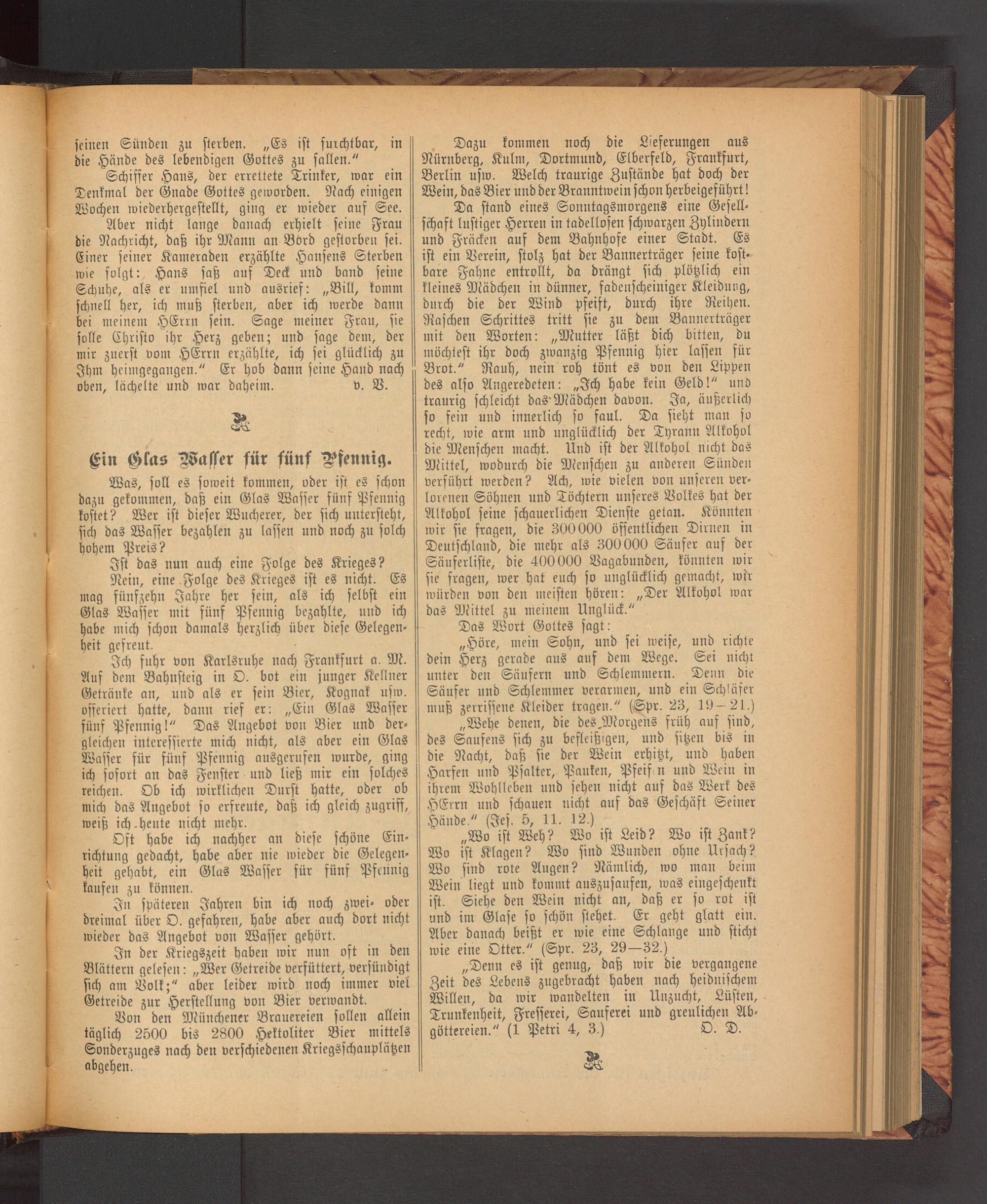 „Denn es ist genug, daß wir die vergangene Zeit des Lebens zugebracht haben nach heidnischem Willen, da wir wandelten in Unzucht, Lüsten, Trunkenheit, Fresserei, Sauferei und greulichen Abgöttereien." (1 Petri 4, 3.) O. D.