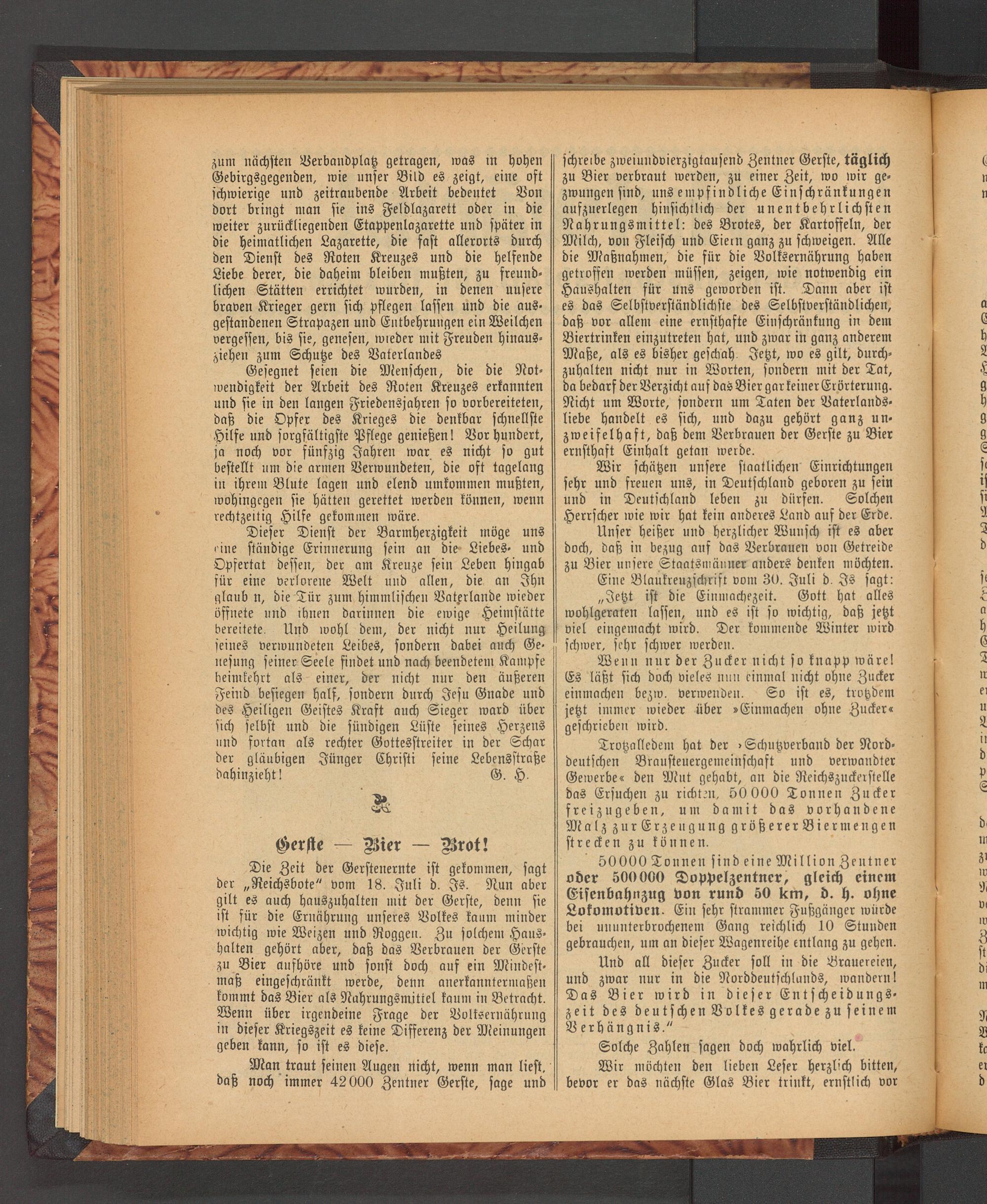 Die Zeit der Gerstenernte ist gekommen, sagt der „Reichsbote" vom 18. Juli d. Js. Nun aber gilt es auch hauszuhalten mit der Gerste, denn sie ist für die Ernährung unseres Volkes kaum minder wichtig wie Weizen und Roggen. Zu solchem Haushalten gehört aber, daß das Verbrauen der Gerste zu Bier aufhöre und sonst doch auf ein Mindestmaß eingeschränkt werde, denn anerkanntermaßen kommt das Bier als Nahrungsmitiel kaum in Betracht. Wenn über irgendeine Frage der Volksernährung in dieser Kriegszeit es keine Differenz der Meinungen geben kann, so ist es diese.