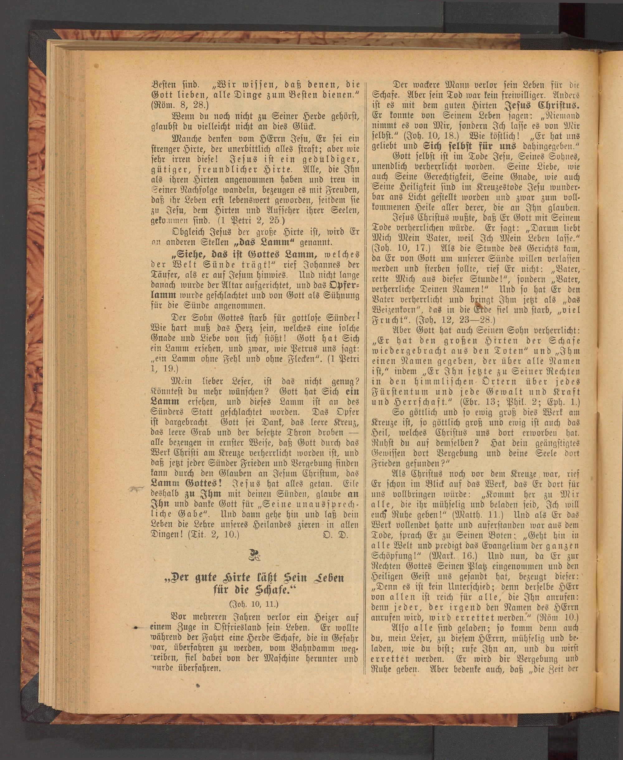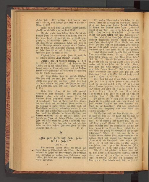 Manche denken vom HErrn Jesu, Er sei ein strenger Hirte, der unerbittlich alles straft; aber wie sehr irren diese! Jesus ist ein geduldiger, gütiger, freundlicher Hirte. Alle, die Ihn als ihren Hirten angenommen haben und treu in Seiner Nachfolge wandeln, bezeugen es mit Freuden, daß ihr Leben erst lebenswert geworden, seitdem sie z» Jesu, dem Hirten und Aufseher ihrer Seelen, geko.innen sind. (1 Petri 2, 25.)
