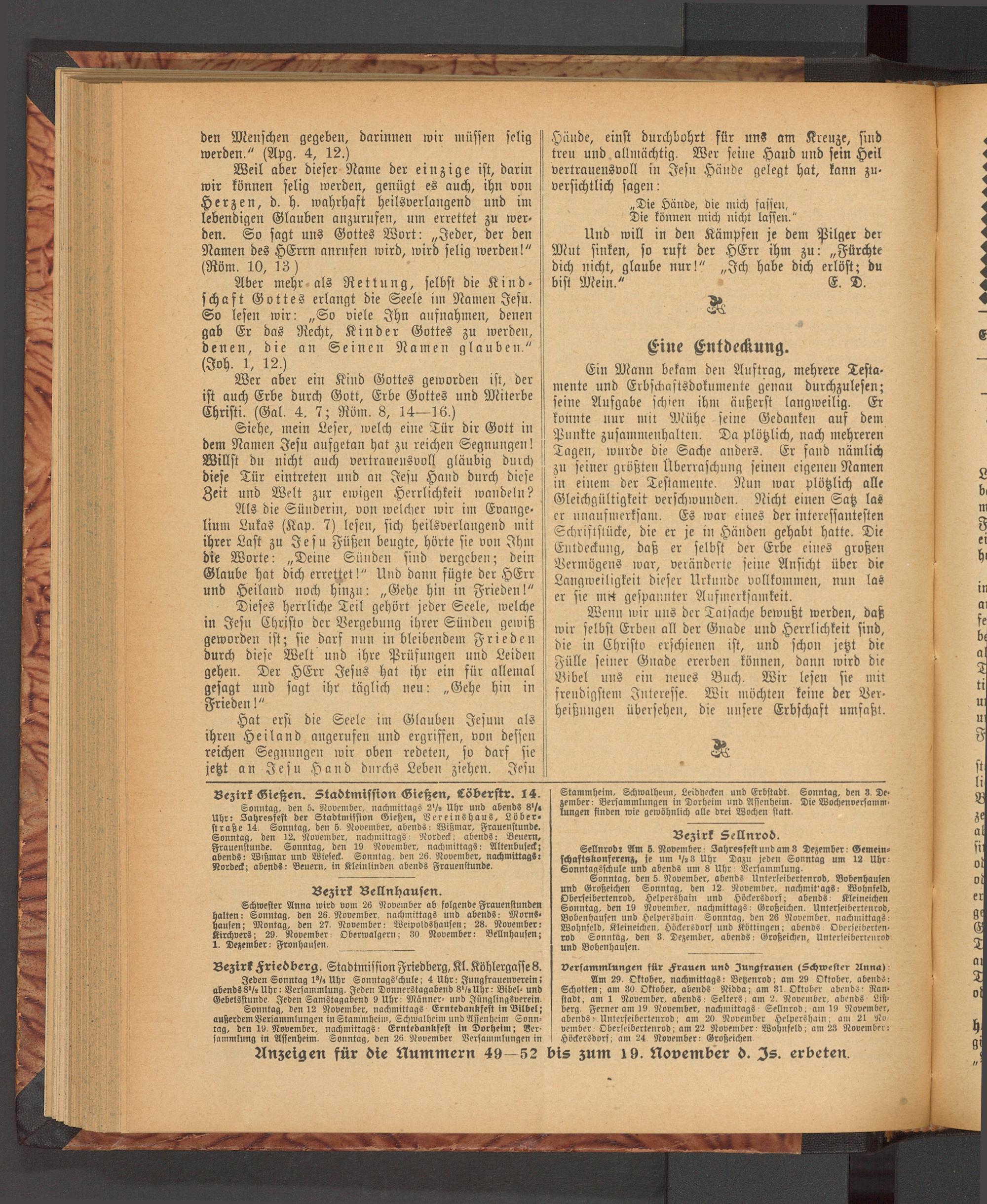 Jeden Sonntag l 8 /4 Uhr Sonntags'chule; 4 Uhr: Jungfrauenverein; abends 8'/r Uhr: Versammlung. Jeden Donnerstagabend 8'/, Uhr: Bibel- und Gebeisstunde. Jeden Samstagabend 9 Uhr: Männer- und Jünglingsverein.