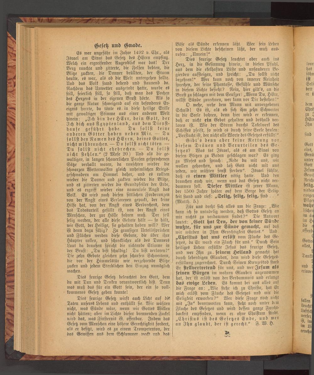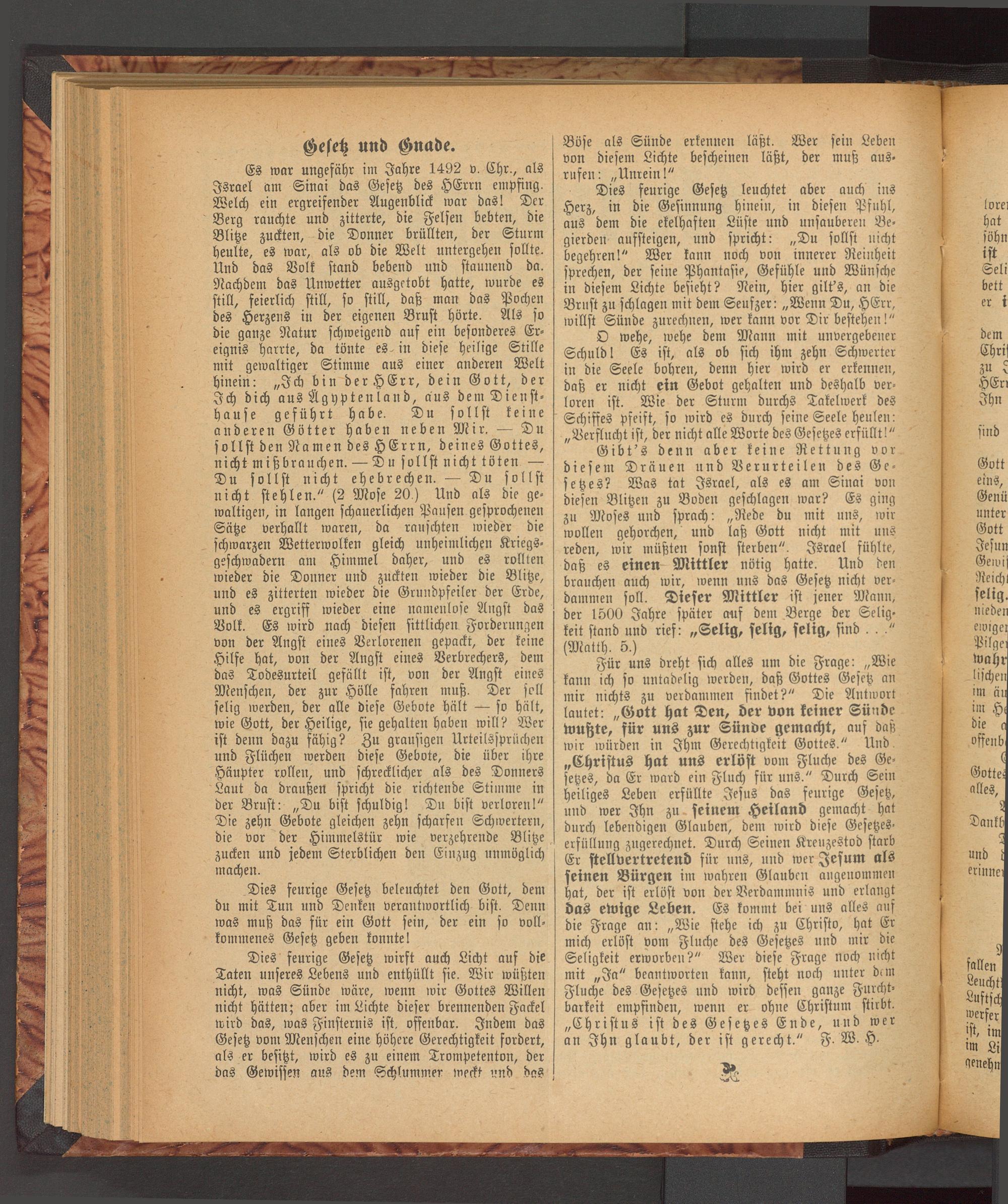 Es war ungefähr im Jahre 1492 v. Ehr., als Israel am Sinai das Gesetz des HErrn empfing. Welch ein ergreifender Augenblick war das! Der Berg rauchte und zitterte, die Felsen bebten, die Blitze zuckten, die Donner brüllten, der Sturm heulte, es war, als ob die Welt untergehen sollte. Und das Volk stand bebend und staunend da. Nachdem das Unwetter ausgetobt hatte, wurde es still, feierlich still, so still, daß man das Pochen des Herzens in der eigenen Brust hörte. Als so die ganze Natur schweigend auf ein besonderes Ereignis harrte, da tönte es . in diese heilige Sülle mit gewaltiger Stimme aus einer anderen Welt hinein: „Ich bin derHErr, dein Gott, der