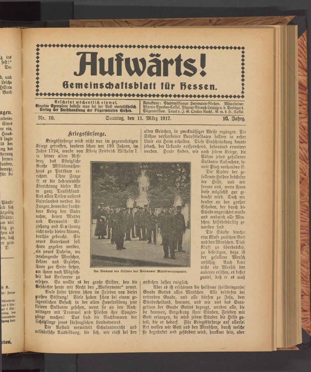 Redakteur: Stadtmissionar Herrmann-Gießen. Mitarbeiter: Pfarrer Sperber-Cassel, Pfarrer Strauß-Leipzig u. d. Prediger d. Pilgerm ission. Druck v. I. G. Onckeu Nachf., G. m. b. Cassel.