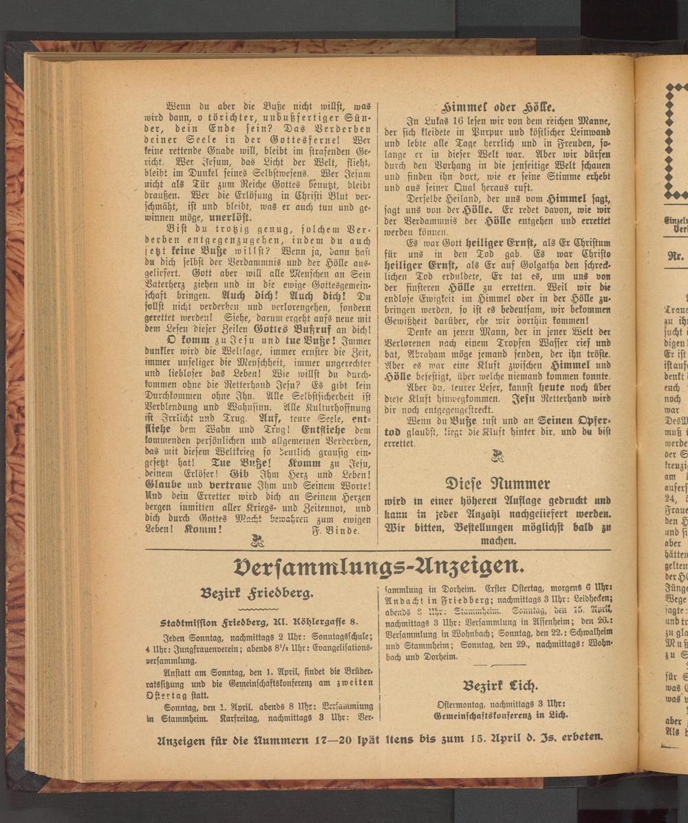 iammlung in Dorheim. Erster Ostertag, morgens 6 Uhr- Andacht in Friedberg; nachmittags 3 Uhr: Leidhecken; abends 3 Uhr: Stammhemr. Sonntag, den 1a. r»vru, nachmittags 3 Uhr: Versammlung in Assenheim; den 20. r Versammlung in Wohnbach; Sonntag, den 22.: Schwalheim und Stammheim; Sonntag, den 29., nachmittags: Wohn- bach und Dorheim.