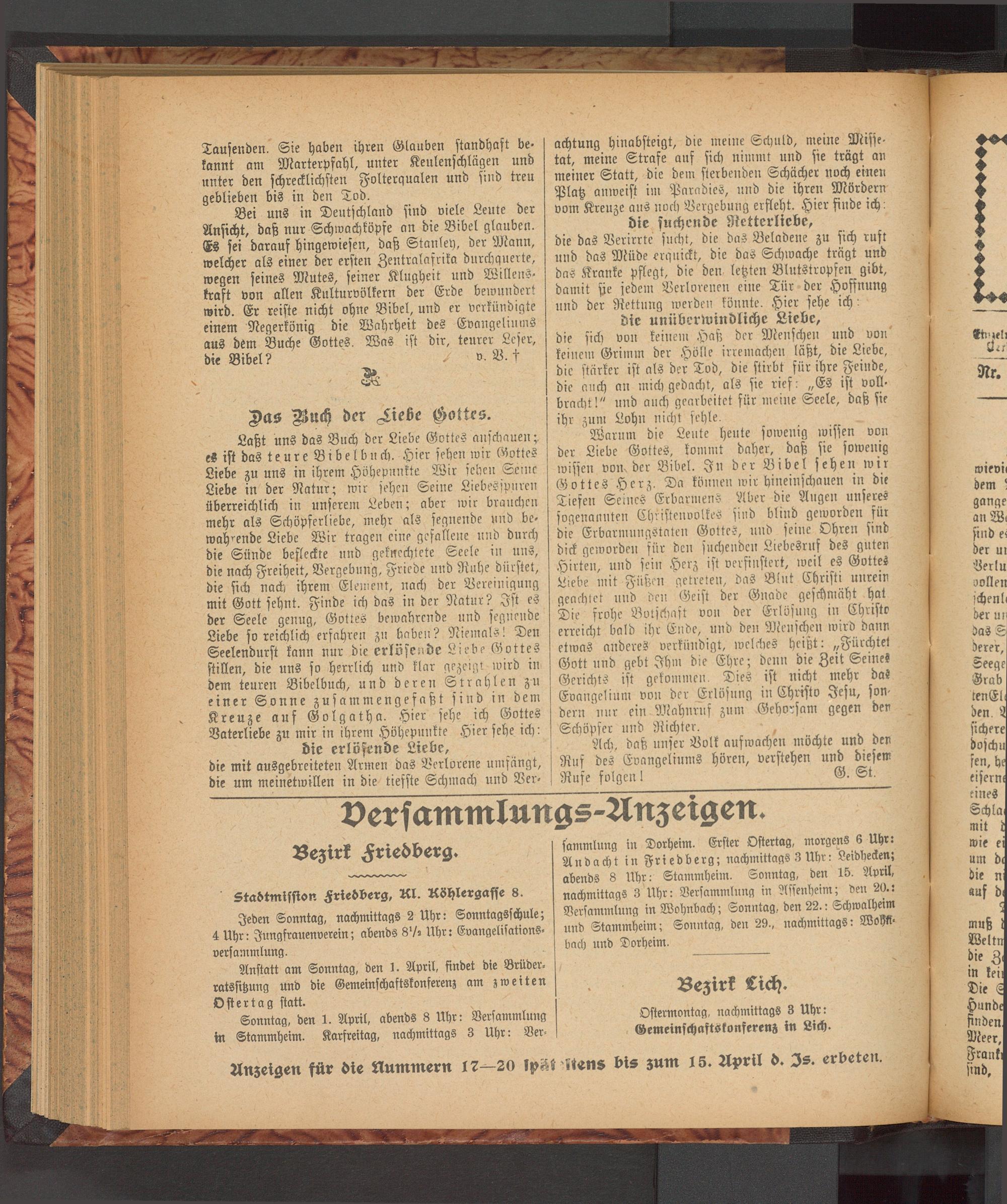 sammlung in Dorheim. Erster Ostertag, morgens 6 Uhr: Andacht in Friedberg; nachmittags 3 Uhr: Leidbecken; abends 8 Uhr: Stammheim. Sonntag, den 15. April, nachmittags 3 Uhr: Versammlung in Assenheim; den 20.: Versammlung in Wohnbach; Sonntag, den 22.: Schwalheim und Stammheim; Sonntag, den 29., nachmittags: Woyli- bach und Dorheim.