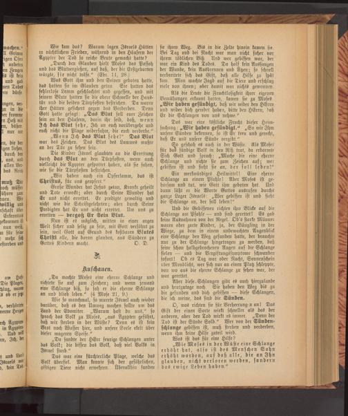 Und die Gebissenen richten ihre Blicke auf die Schlange am Pfahle— und sind gerettet! Es gab keine Ausnahmen von der Regel. Ob's starke Männer waren oder zarte Kinder, ja, der Säugling in der Wiege, zu dem in einem unbewachten Augenblick eine Schlange den Weg gefunden hatte, der brauchte nur zu der Schlange hingetragen zu werden, daß seine schon halbgebrochenen Augen auf die Schlange fielen — und die Vergiftungssymptome schwanden sofort! Ob es Tag war oder Nacht, Sonnenschein oder Mondlicht, wer sich nur an einen Platz schleppte, von >vo aus die eherne Schlange zu sehen war, der war gerettet.