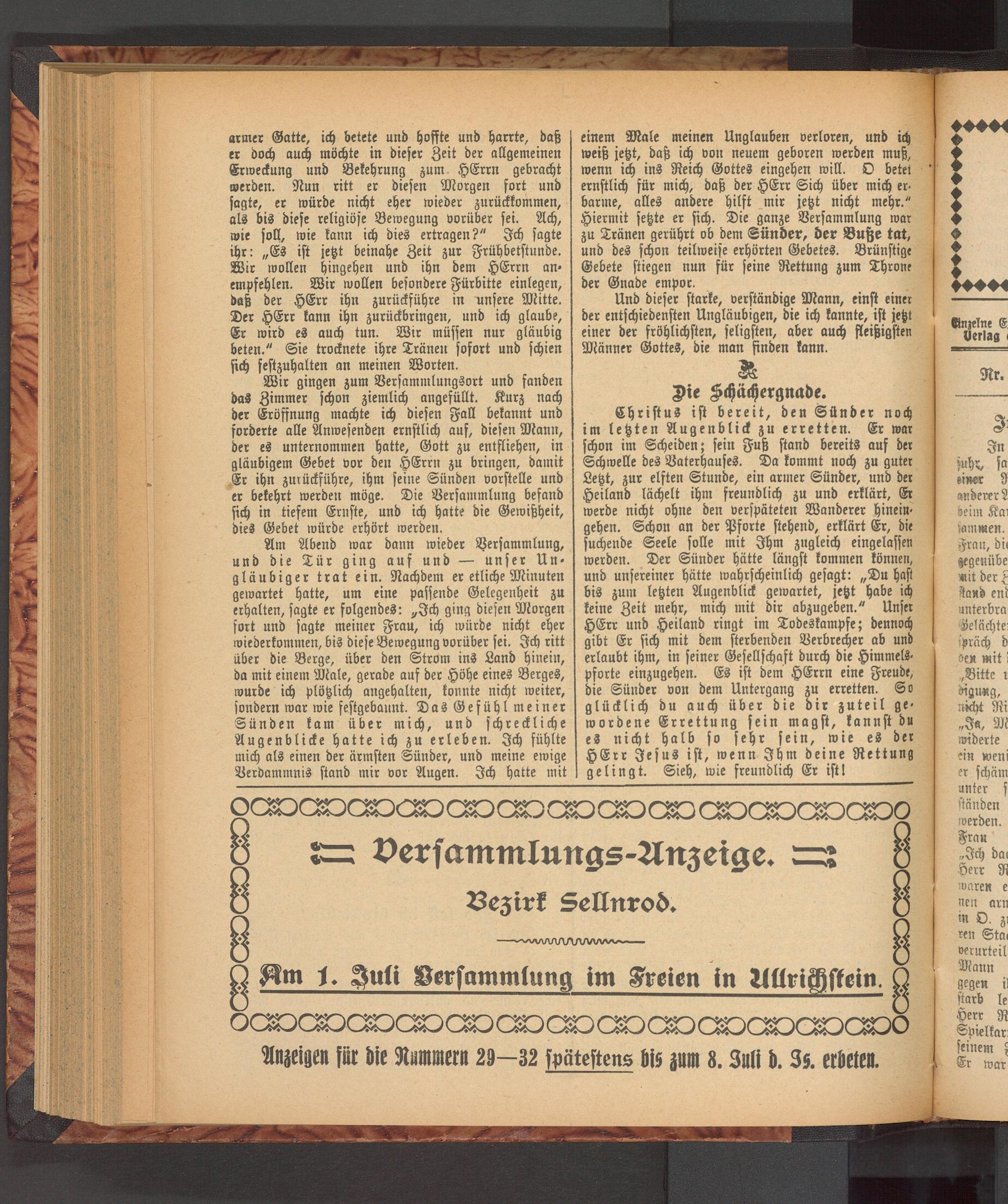 Am Abend war dann wieder Versammlung, und die Tür ging auf und — unser Ungläubiger trat ein. Nachdem er etliche Minuten gewartet hatte, um eine passende Gelegenheit zu erhalten, sagte er folgendes: -Ich ging diesen Morgen fort und sagte meiner Frau, ich würde nicht eher wiederkommen, bis diese Bewegung vorüber sei. Ich ritt über die Berge, über den Strom ins Land hinein, da mit einem Male, gerade auf der Höhe eines Berges, wurde ich plötzlich angehalten, konnte nicht weiter, sondern war wie festgebannt. Das Gefühl meiner Sünden kam über mich, und schreckliche Augenblicke hatte ich zu erleben. Ich fühlte mich als einen der ärmsten Sünder, und meine ewige Verdammnis stand mir vor Augen. Ich hatte mit