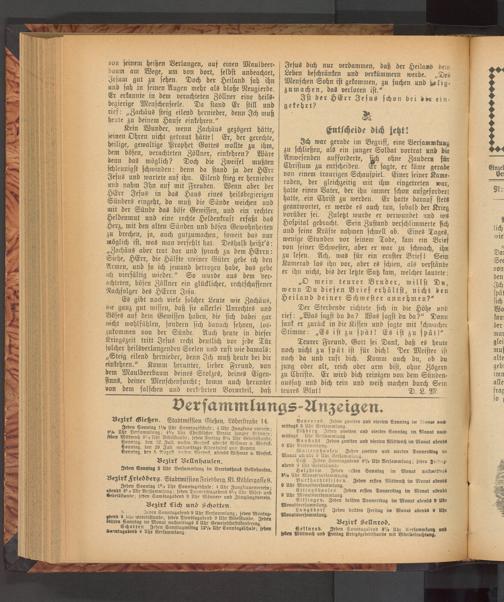 Jeden Sonntag 1»/« Uhr Sonntagsschule; 4 Uhr Jungsrauenverein' «bend» 8‘ i Uhr Versammlung; jeden Donnerstagabend 8‘n Uhr Bibel- und »ebetSstunde; jeden Samstagabend 9 Uhr Männer, und Jünglingsverein.
