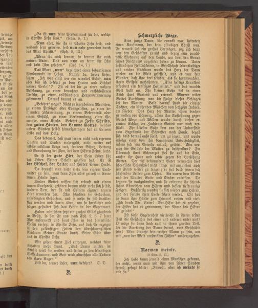 Eine junge Dame, die erweckt war, heiratete einen Kaufmann, der kein gläubiger Christ war. Er erwarb sich ein großes Vermögen, zog sich dann von den Geschäften zurück und bezog eine Pracht- volle Wohnung auf dem Lande, um dort den Genuß seines Reichtums ungestört haben zu können. Unter beständigen Festlichkeiten, in Gesellschaft lebenslustiger und reicher Nachbarn wurde das Herz der Dame wieder an die Welt gefesselt, und es war kein Wunder, daß ihre drei Kinder, als sie heranwuchsen, ihrem Beispiel nachahmten. „Eine heftige Krankheit erfordert ein kräftiges Heilmittel," und das wandte Gott bald an. Ihr kleiner Sohn fiel in einen Teich ihres Gartens und ertrank. Murren wider Gottes Vorsehung war die Folge dieses Schlages bei der Mutter. Bald darauf starb die einzige Tochter, ein blühendes Mädchen von sechzehn Jahren, am Fieber. Das Herz der Mutter schien brechen zu wollen vor Schmerz, allein ihre Auflehnung gegen Gottes Wege und Willen wurde durch diesen erneuten Schlag der Zuchtrute Gottes nur noch verstärkt. Ihr ältester Sohn kam von der Universität zum Begräbnis der Schwester nach Hause, begab sich bald darauf aufs Feld, um zu jagen, und wurde infolge einer von ihm begangenen Unvorsichtigkeit, indem sich sein Gewehr entlud, getötet. Wer vermag die Gefühle der Mutter zu beschreiben? Im Übermaß ihres Schmerzes fiel sie auf die Erde, raufte ihr Haar und tobte gegen die Vorsehung Gottes. Der tief bekümmerte Vater vermochte dies schreckliche Schauspiel nicht lange mit anzusehen noch sein Elend weiter zu tragen; er fiel bald seinen sich häufenden Leiden zum Opfer. So waren dem Weibe und der Mutter Gatte und Kinder entrissen. Da begann sie nachzudenken, und sie erkannte ihr schreckliches Abweichen vom HErrn und dessen tieftraurige Folgen. Bußfertig wandte sie sich wieder zum HErrn, und der Friede ihrer Seele kehrte wieder. Oft hob sie dann ihre Hände zum Himmel empor und rief: „Ich danke Dir, Vater! Der HErr hat es gegeben, der HErr hat es genommen, der Name des HErrn sei gelobt!"