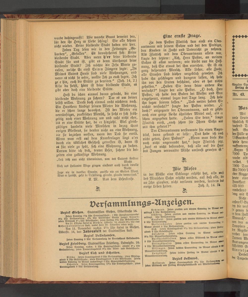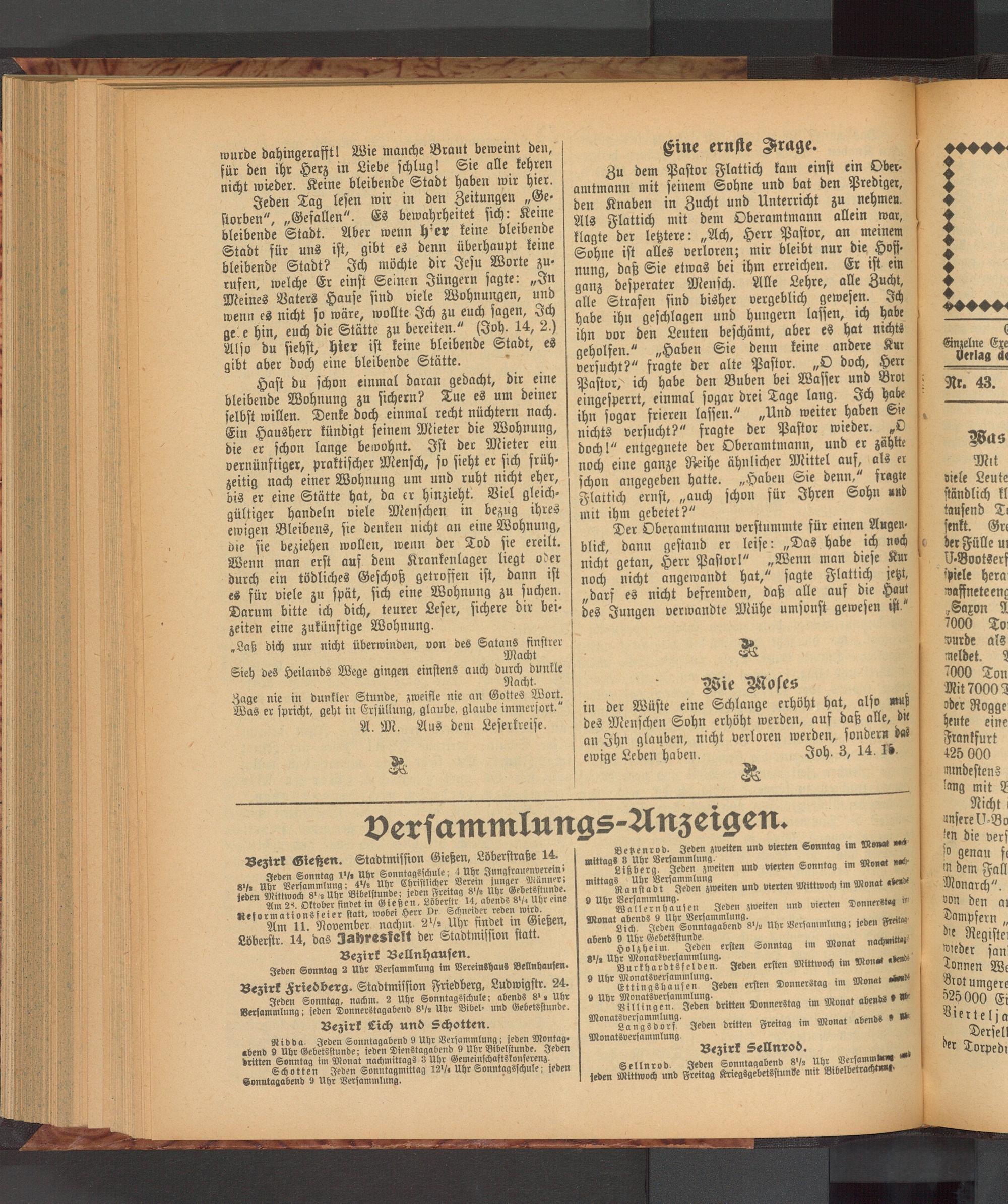 Jeden Sonntag, nachm. 2 Uhr Sonntagsschule; abends 8‘s Uhr Lerlammlung; jeden Donnerstagabend 8 1 /* Uhr Bibel- und Gebetsstunde.