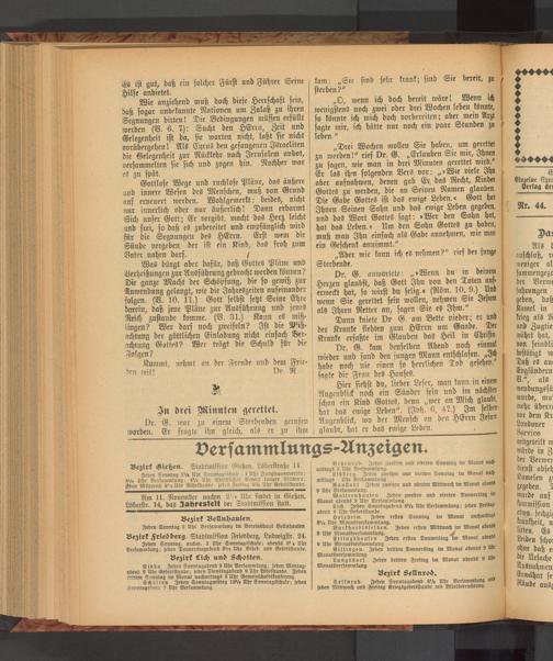 Nidda Jeden Sonntagabend 9 Uhr Versammlung; jeden Montagabend 9 Uhr Gebetsstunde; jeden Dienstagabend 9 Uhr Bibelstnnde. Jeden dritten Sonntag im Monat nachmittags 3 Uhr Gemeinjchastskonserenz.