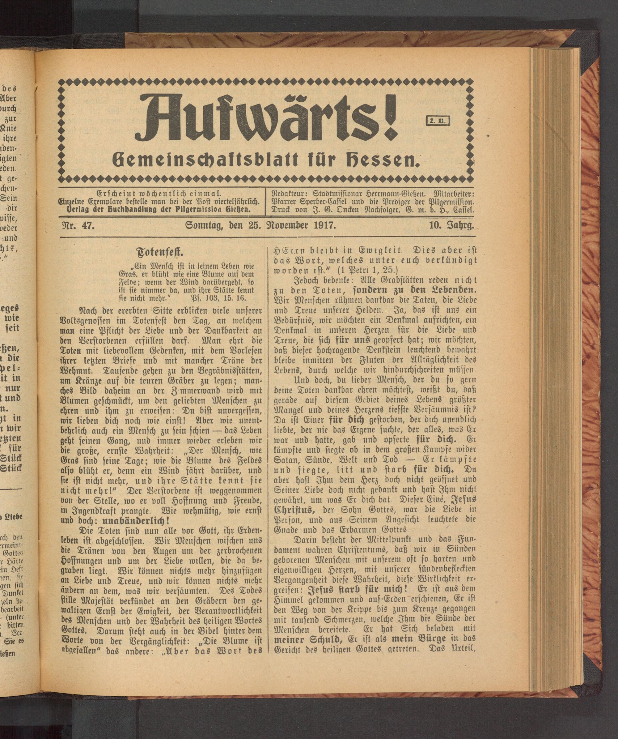 Redakteur: Stadtmissionar Herrmann-Gießen. Mitarbeiter: Pfarrer Sperber-Cassel und die Prediger der Pilgermission. Druck von I. G. Lucken Nachfolger, G. m. b. H„ Cassel.