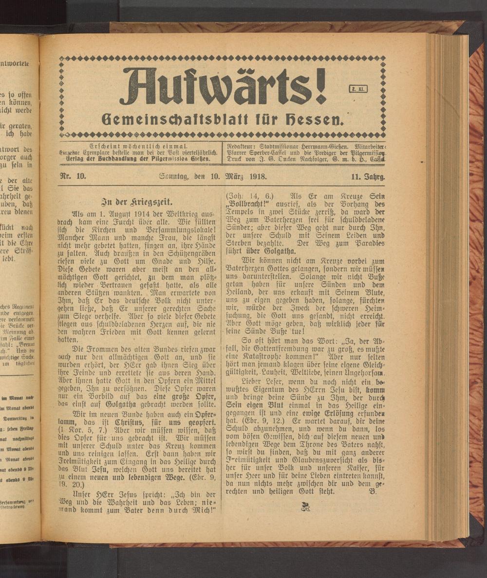 Redakteur: Stadtmissionar Herrmann-Gießen. Mitarbeiter- Pfarrer Sperber-Cassel und di« Prediger der Pilgermissio». Druck von I. G. Lucken Nachfolger, G. m. b. H., Cafset.