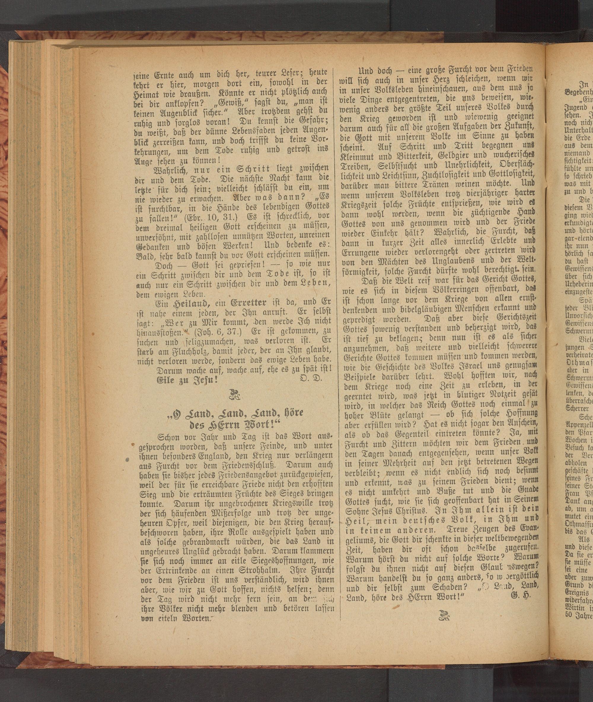 Daß die Welt reif war für das Gericht Gottes, wie es sich in diesem Völkerringen offenbart, das ist schon lange vor dem Kriege von allen ernst- denkenden und bibelgläubigen Menschen erkannt und gepredigt worden. Daß aber diese Gerichtvzeit Gottes sowenig verstanden und beherzigt wird, das ist tief zu beklagen^ denn nun ist es als sicher anzunehmen, daß weitere und vielleicht schwerere Gerichte Gottes kouimen müssen und kommen werden, wie die Geschichte des Volkes Israels uns genugsam Beispiele darüber lehrt. Wohl hofften wir, nach dem Kriege noch eine Zeit zu erleben, in der geerntet wird, was jetzt in blutiger Notzeit gesät wird, in welcher das Reich Gottes noch einmal zu hoher Blüte gelangt — ob sich solche Hoffnung aber erfüllen ivird? Hat es nicht sogar den Anschein, als ob das Gegenteil eintretcn könnte? Ja, mit Furcht und Zittern möchten wir dem Frieden und den Tagen danach entgegensehen, wenn unser Voll in seiner Mehrheit auf den jetzt betretenen Wegen verbleibt; wenn es nicht endlich sich noch besinnt und erkennt, was zu seinem Frieden dient; wenn es nicht umkehrt und Buße tut und die Gnade Gottes sucht, wie sie sich geoffenbart hat in Seinem Sohne Jesus Christus. In Ihm allein ist dein Heil, mein deutsches Volk, in Ihm und in keinem anderen. Treue Zeugen des Evangeliums, die Gott dir schenkte in dieser weltbewegenden Zeit, haben dir oft schon dasselbe zugerufen. Warum hörst du nicht auf solche Wortes Warum folgst du ihnen nicht auf diesen Glaub nswegen? Warum handelst du so ganz anders, 1° w.vergöttlich und dir selbst zum Schaden? „O O ld, Land, Land, höre des HErrn Wort!" G. £>■