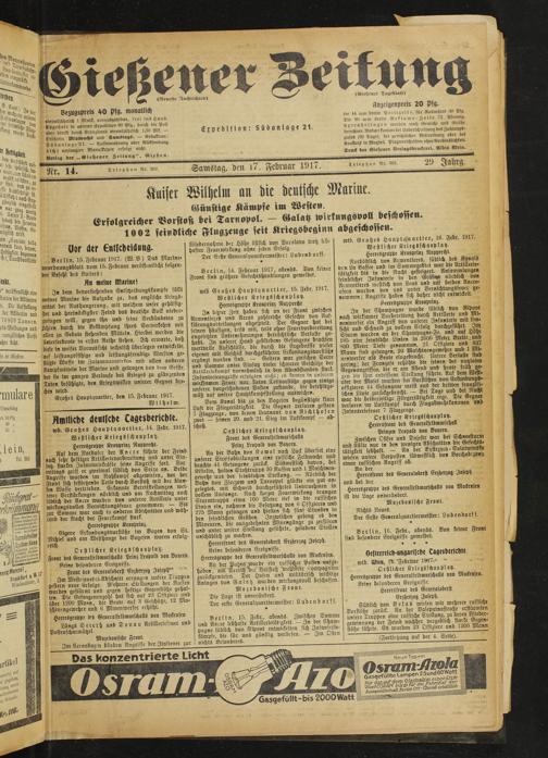 Berlin, 14. Februar 1917, abends. Von keiner Front sind größere Gesechtshandlungen gemeldet.