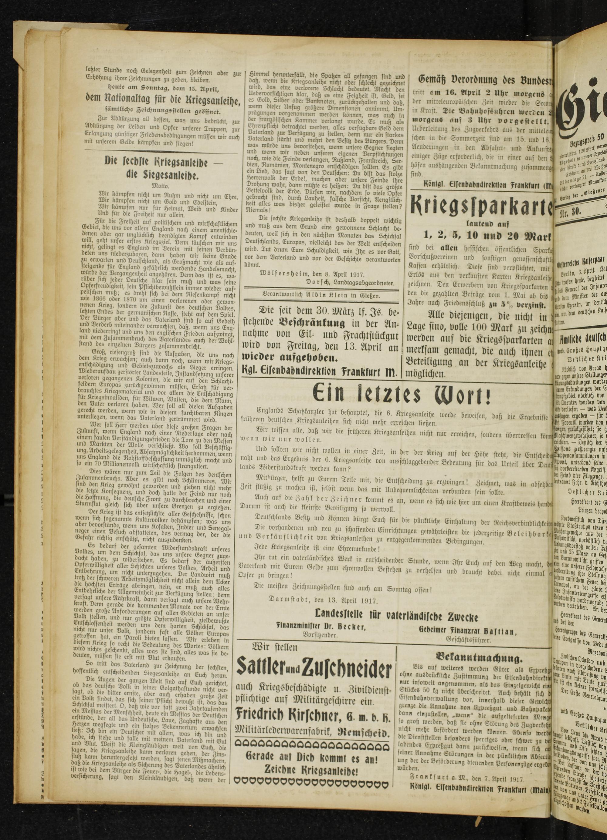 Die sechste Krieganleihe ist deshalb doppelt wichtig und muß aus dem Grund eine gewonnene Schlacht be- deuten, weil sich in den nächsten Monaten das Schicksal Deutschlands, Europas, vielleicht das der Welt entscheiden wird. Tut drum Eure Schuldigkeit, wie Ihr es vor Gott, vor dem Vaterland und vor der Geschichte verantworten könnt.