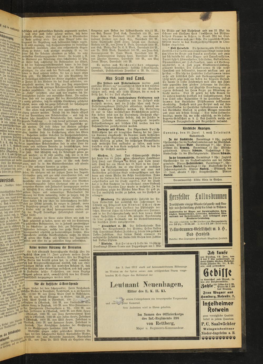 Konzertes zum Besten der U-Boot-Spende 604,15 M., von Geh. Baurat Prof. Koch, Darmstadt 100 M., von Lehrer Keim in Dortelweil 165,80 M., von Generalleutnant Freiherr von Heyl, Exz., Darmstadt 500 M., Seine Durchlaucht Fürst Franz Joseph von Isenburg- Birstein 100 M., von Firma E. Merk, Darmstadt 5000 M., von Geh. Mediz.-Rat Dr. E. A. Merk, Darmstadt 500 M., von Dr. Willi Merk, Darmstadt 500 M., von Frau Geh. Kommerzienrat Dr. Louis Merck, Darmstadt 500 M., von Kommerzienrat Ludwig Heyn, Darmstadt 500 M., von Theodor Stemmer, Darmsladt 100 M., von Max Ionas Meyer, Darmstadt 100 M.