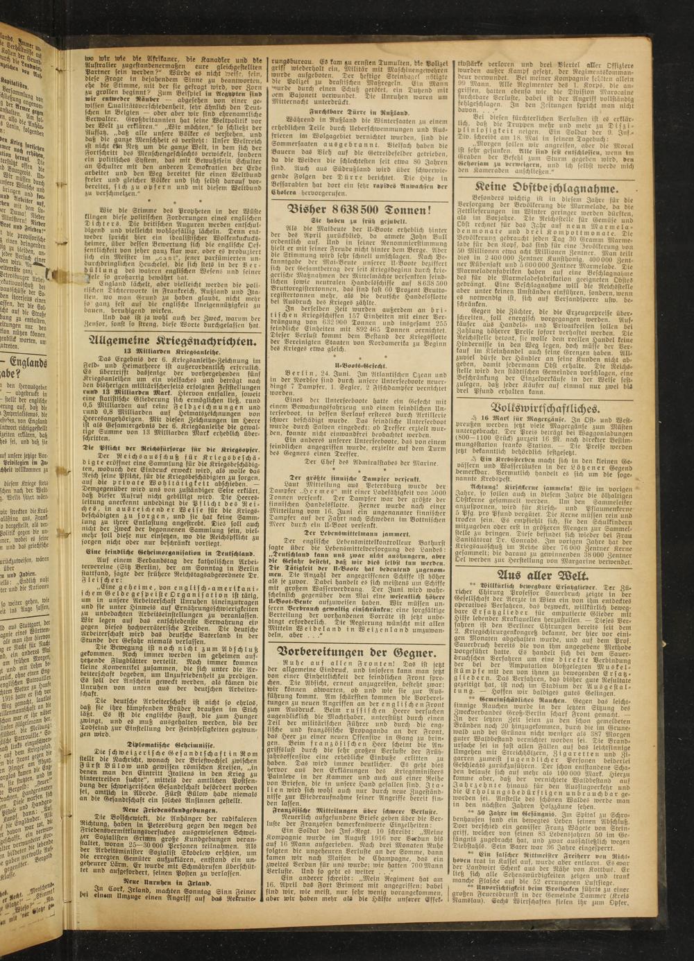 Ruhe auf allen Fronten.' Das ist jetzt der allgemeine Eindruck, und insofern kann man jetzt von einer Einheitlichkeit der feindlichen Front sprechen. Die Absicht, erneut anzugreifen, besteht zwar: wir können abwarten, ob und wie sie zur Ausführung kommt. Am schärfsten kommen die Vorbereitungen zu neuen Angriffen an der e n g l i s ch e n Front zum Ausdruck. Beim russischen Heere versuchen augenblicklich die Machthaber, unterstützt durch einen Teil der militärischen Führer und durch die englische und französische Propaganda an der Front, das Heer zu einer neuen Offensive in Gang zu &nn* gen. Bern» französischen Heer scheint die Angriffslust durch die sehr großen Verluste der Frühahrsoffensive eine erhebliche Einbuße erlitten zu haben. Das wird immer deutlicher. Es geht dies hervor aus den Erklärungen des Kriegsministers Painleve in der Kammer und auch aus einer Reihe von Briefen, die in unsere Hand gefallen sind. Italien wird sich wohl auch nur durch neue Zugeständnisse zur Wiederaufnahme seiner Angriffe bereit finden lassen.