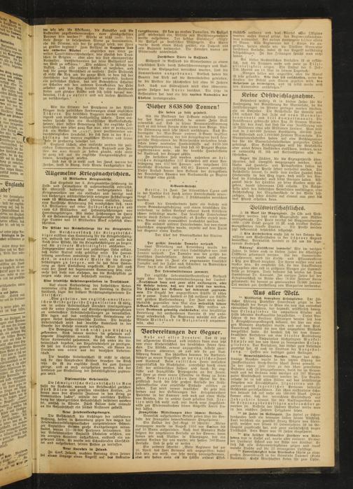 hielt er mit seiner Freude nicht hinter dem Berge. Aber die Stimmung wird sehr schnell Umschlagen. Nach Bekanntgabe der Mai-Beute unserer U-Boote beziffert sich der Gesamtbetrag der seit Kriegsbeginn durch kriegerische Maßnahmen der Mittelmächte versenkten feindlichen sowie neutralen Handelsschiffe auf 8 688 500 Bruttoregistertonnen, das sind fast 60 Prozent Brutto- regtstertonnen mehr, als die deutsche .Handelsflotte bei Ausbruch des Krieges zählte.