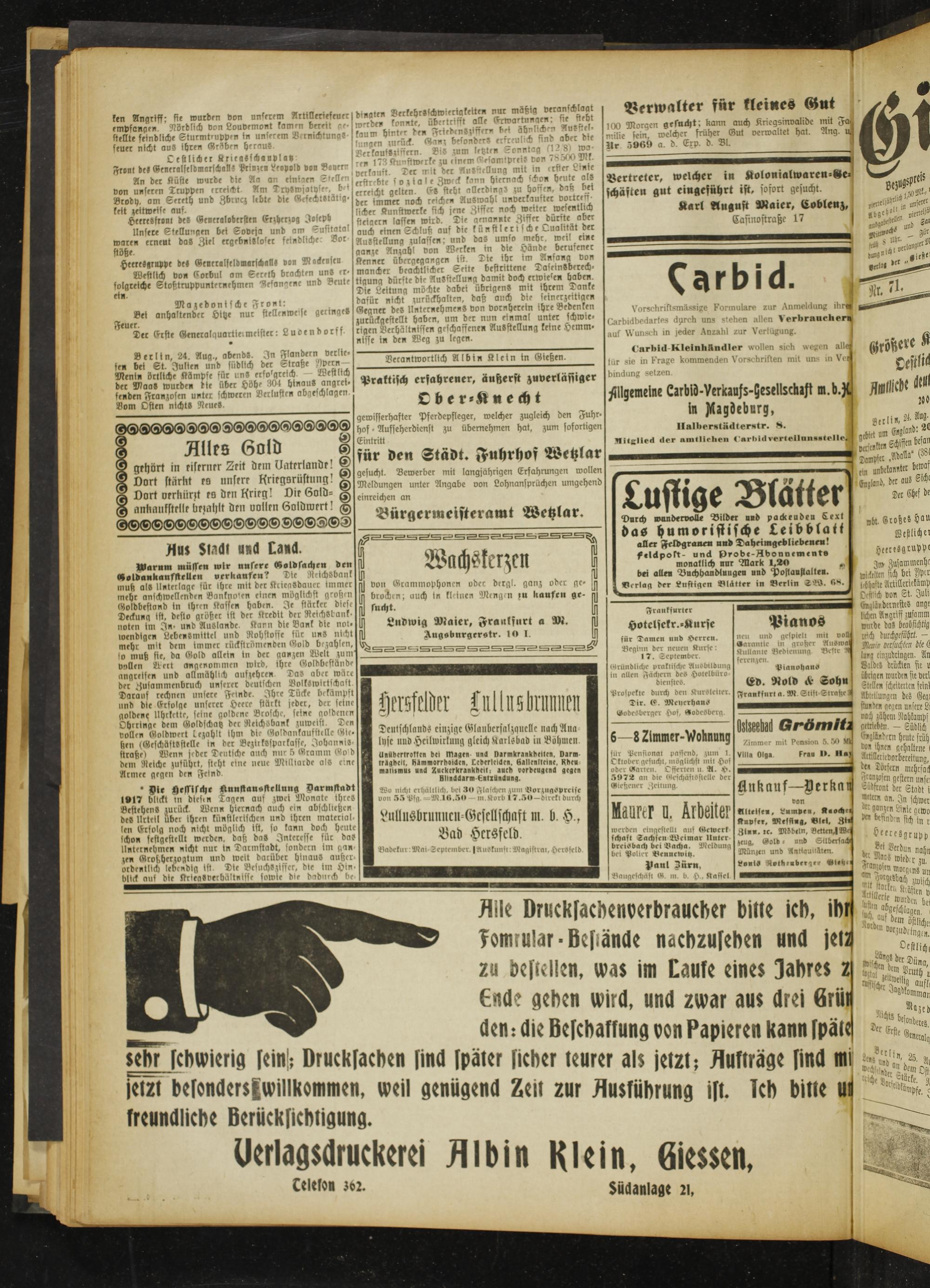 Warum müssen mir unsere «oldsacheu den Goldaukaufssellen verkaufen? Die Reichsbank muß als Unterlage für ihre mit der Krieasdauec immer mehr anschwellenden Banknoten einen möglichst großen Goldbestand in ihren Kossen haben. Je stärker diese Deckung ist. desto größer ist der Kredit der Reichsbank, noten im In« und Auslande. Kann die Bank die not- ioendigcn Lebensmittel und Rohstoffe für unS nicht mehr mit dem immer rückströmenden Gold bezahlen, jo muß fie, da Gold allein in der ganzen Welt zum vollen Wert angenommen wird, ihre Goldbestände angceisen und allmählich auszehren Das aber wäre der Zusammenbruch unserer deutschen Volkswirtschaft Darauf rechnen unsere Feinde. Ihre Tücke bekämpft und die Erfolge unserer Heere stärkt jeder, der seine goldenx Uhrkette, seine goldene Brosche, seine goldenen Ohrringe dem Goldschatz der Reichsbank zuweist. Den vollen Goldwert bezahlt ihm die Golhaiikaufltcllc (Mif fern (Geschäftsstelle in der Bezirkssparkasse. Johannis- straße) Wenn jeder Deutsche auch nur 5 Gramm Go d dem Reiche zusührt, steht eine neue Milliarde als c:ne Armee gegen den Feind.