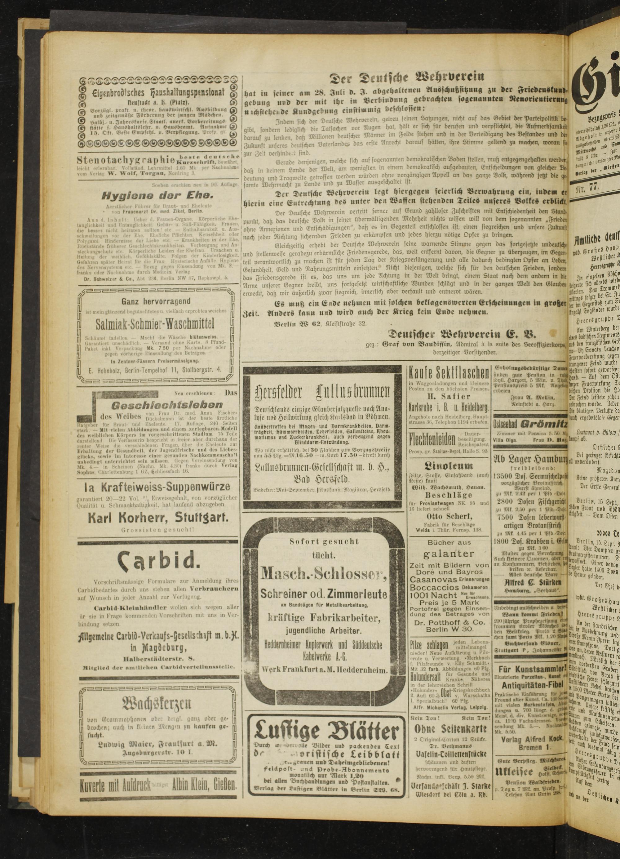 Gleichzeitig erhebt der Deulsche Wehrverein seine warnende Stimme gegen das fortgesetzte undeutschr und stellenweise geradezu erbärmliche Friedensgerede. das, weil enlfernl davon, die Gegner zu überzeugen, im Gegen teil oeranlwortlich zu machen ist für jeden Tag der Kriegsverlängerung und alle dadurch bedingten Opfer an Leben, Gesundheit, Geld und Nahrungsmitteln einsehten. Nicht diejenigen, welche sich für den deutschen Frieden, sondern das Friedensgerede ist es, das uns um jede Achtung in der Welt bringt, einem Staat nach dem andem in d«