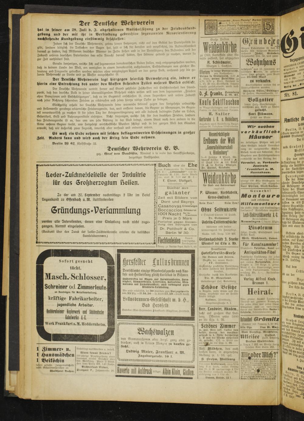 Der Deutsche Wehwerein vertritt femer aus Grund zahlloser Zuschriften mit Entschiedenheit den Stand- Punkt, daß das deutsche Volk in seiner überwältigenden Mehrheit nichts wissen will von dem sogenarmten „Frieden ohne Annexionen und Entschädigungen", daß es im Gegenteil entschlossen ist, einen siegreichen und unsere Zukunft nach jeder Richtung sichernden Frieden zu erkämpfen und jedes hierzu nötige Opfer zu bringen.