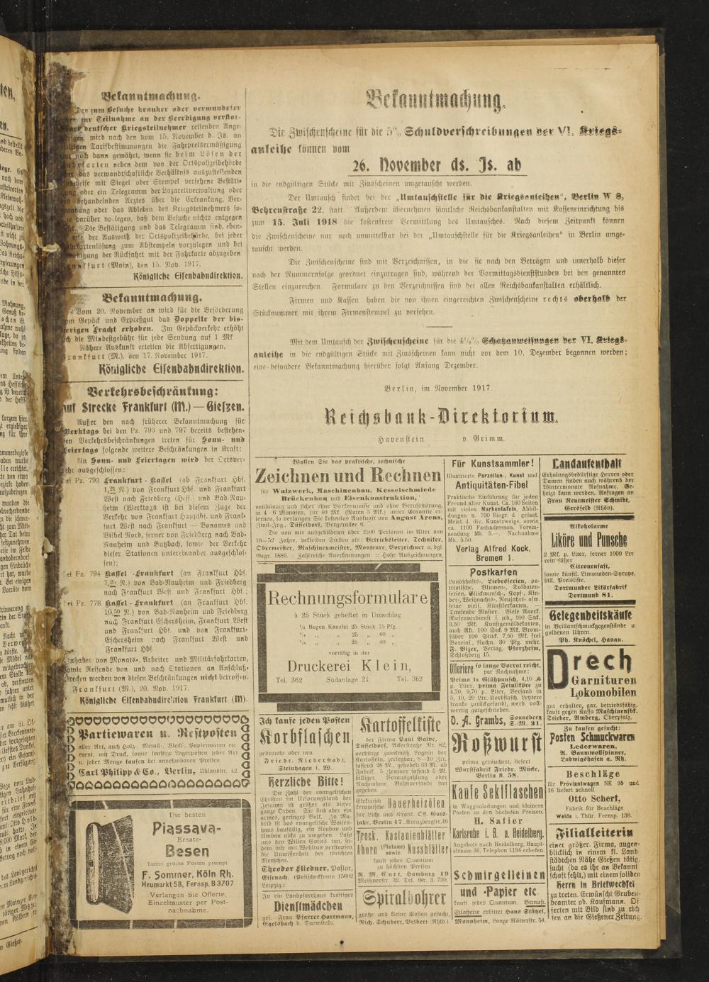 LShaber. von Monats-, Arbeiter und Militärfahckarten, ^rwie Reisende von und nach Stationen an Anschluß» strecken werden von diesen Beschränkungen nicht betroffen. Frankfurt (M.), 20. Nov. 1917.