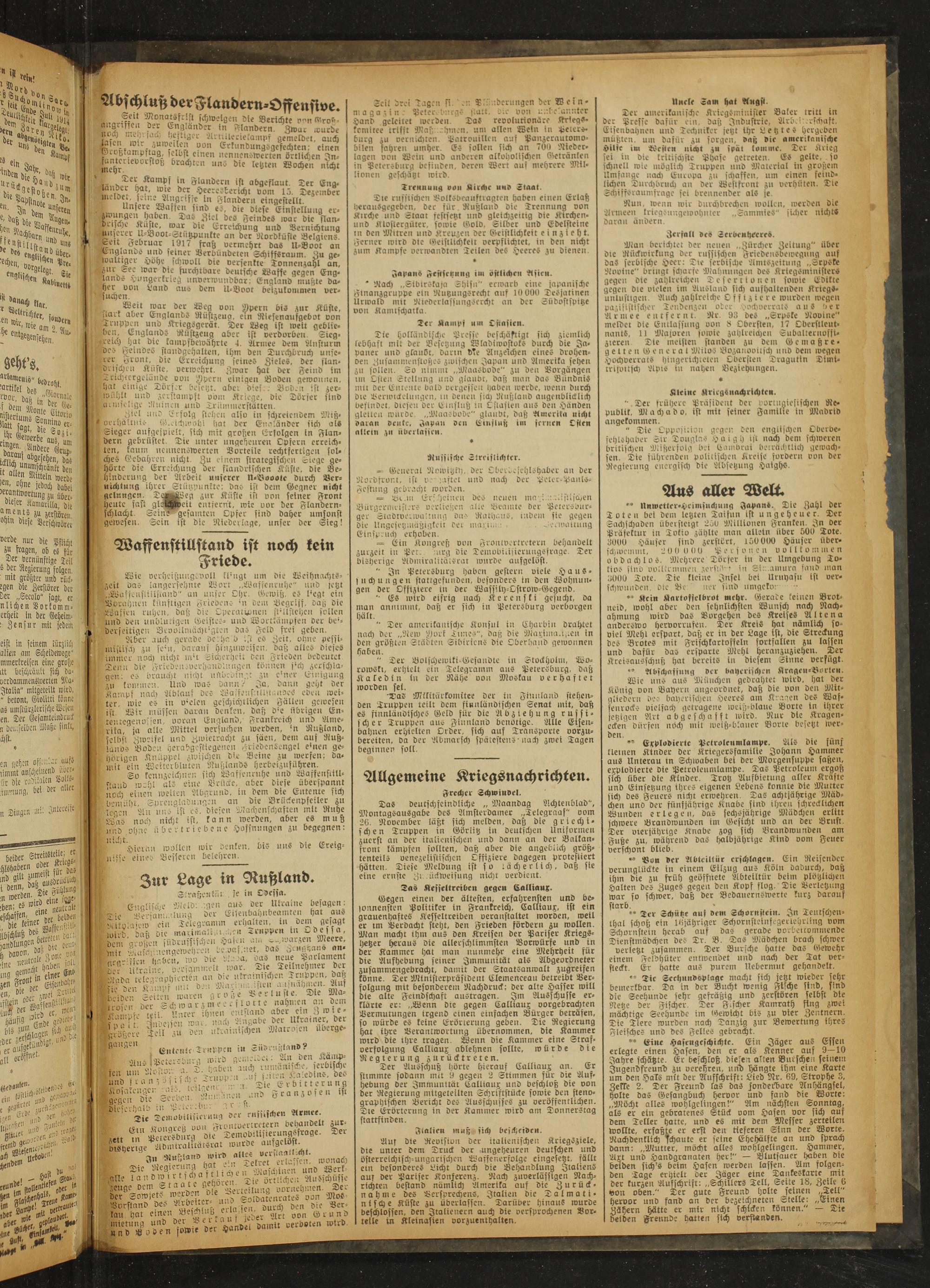Wie verheißungsvoll lfingt um die Weihnachtszeit oas langersehnte Wort „Waffenruhe" iuiö jetzt ..-Waffenstillstand" an unser Ohr. Gewiß, es ttegt ein Borahnen künftigen Friedens ’n Dem Begriff, daß die Waffen ruhen, daß die Operationen ft ; aftcl)C!i sollen und den unblutigen Geistes- uicd Worrkämpfen der be** derseitigen BevöUntächt'gren das Feld frei geben.