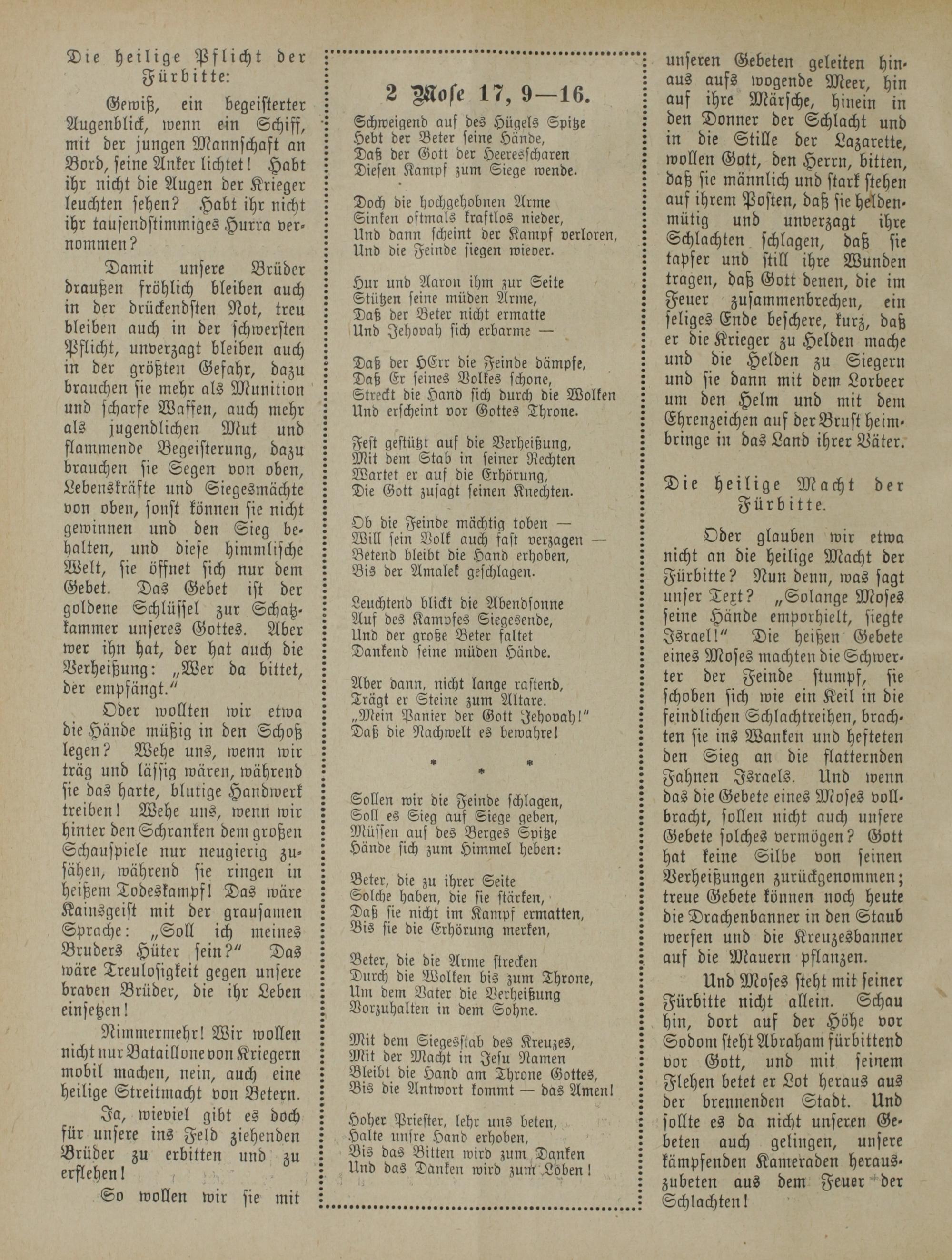 unseren Gebeten geleiten hinaus aufs wogende Meer, hin auf ihre Märsche, hinein in den Donner der Schlacht und in die Stille der Lazarette, wollen Gott, den Herrn, bitten, daß sie männlich und stark stehen auf ihrem Posten, daß sie Helden- mütig und unverzagt ihre Schlachten schlagen, daß sie tapfer und still ihre Wunden tragen, daß Gott denen, die im Feuer zusammenbrechen, ein seliges Ende beschere, kurz, daß er die Krieger zu Helden mache und die Helden zu Siegern und sie dann mit dem Lorbeer um den Helm und mit dem Ehrenzeichen auf derBrust heimbringe in das Land ihrer Väter.