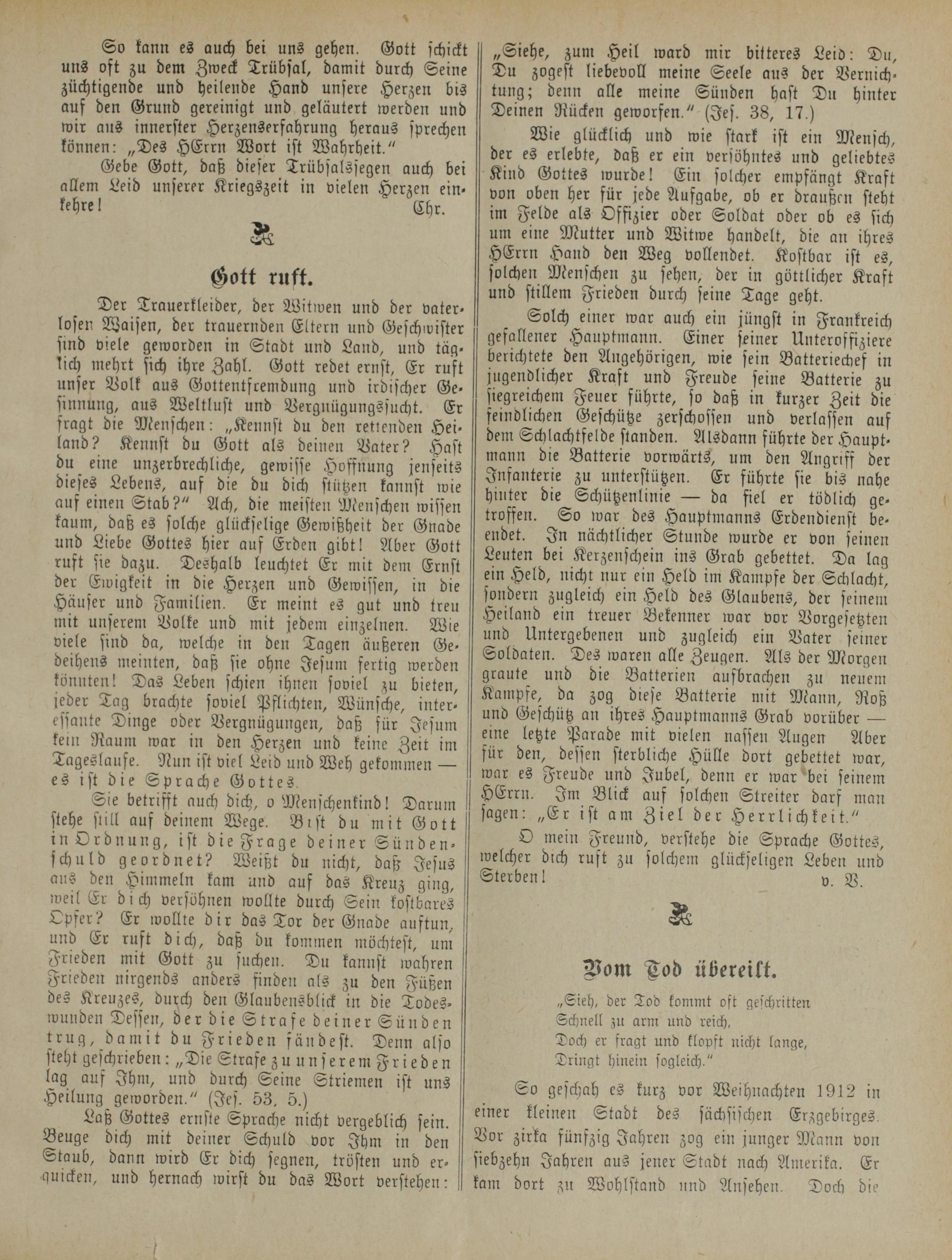 Gebe Gott, daß dieser Trübsalssegen auch bei allem Leid unserer Kriegszeit in vielen Herzen ein- kehre I Ehr.
