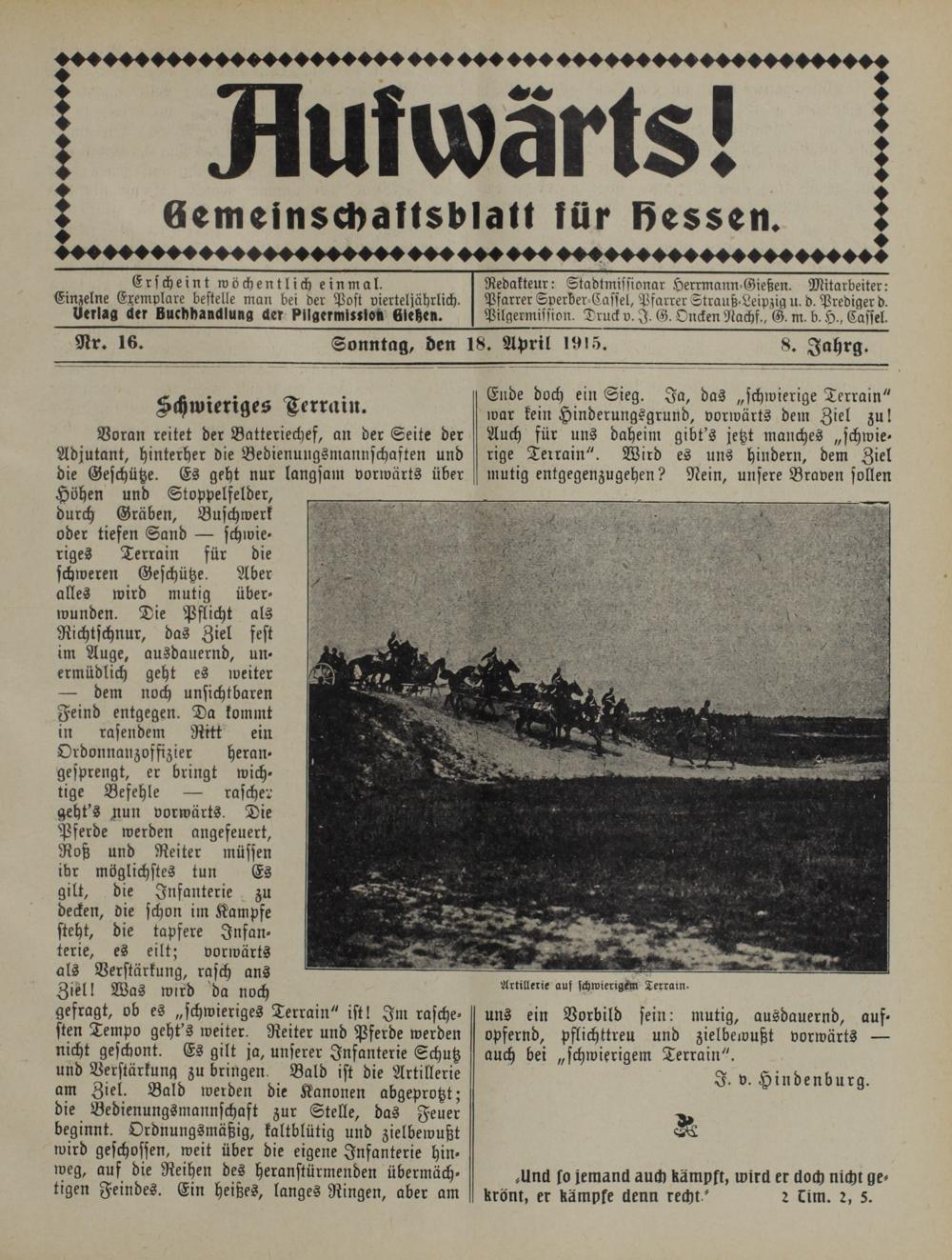 Ende doch ein Sieg. Ja, das „schwierige Terrain" war kein Hinderungsgrund, vorwärts dem Ziel zu! Auch für uns daheim gibt's jetzt manches „schwie- rige Terrain". Wird es uns hindern, dem Ziel mutig entgegenzugehen? Nein, unsere Braven sollen