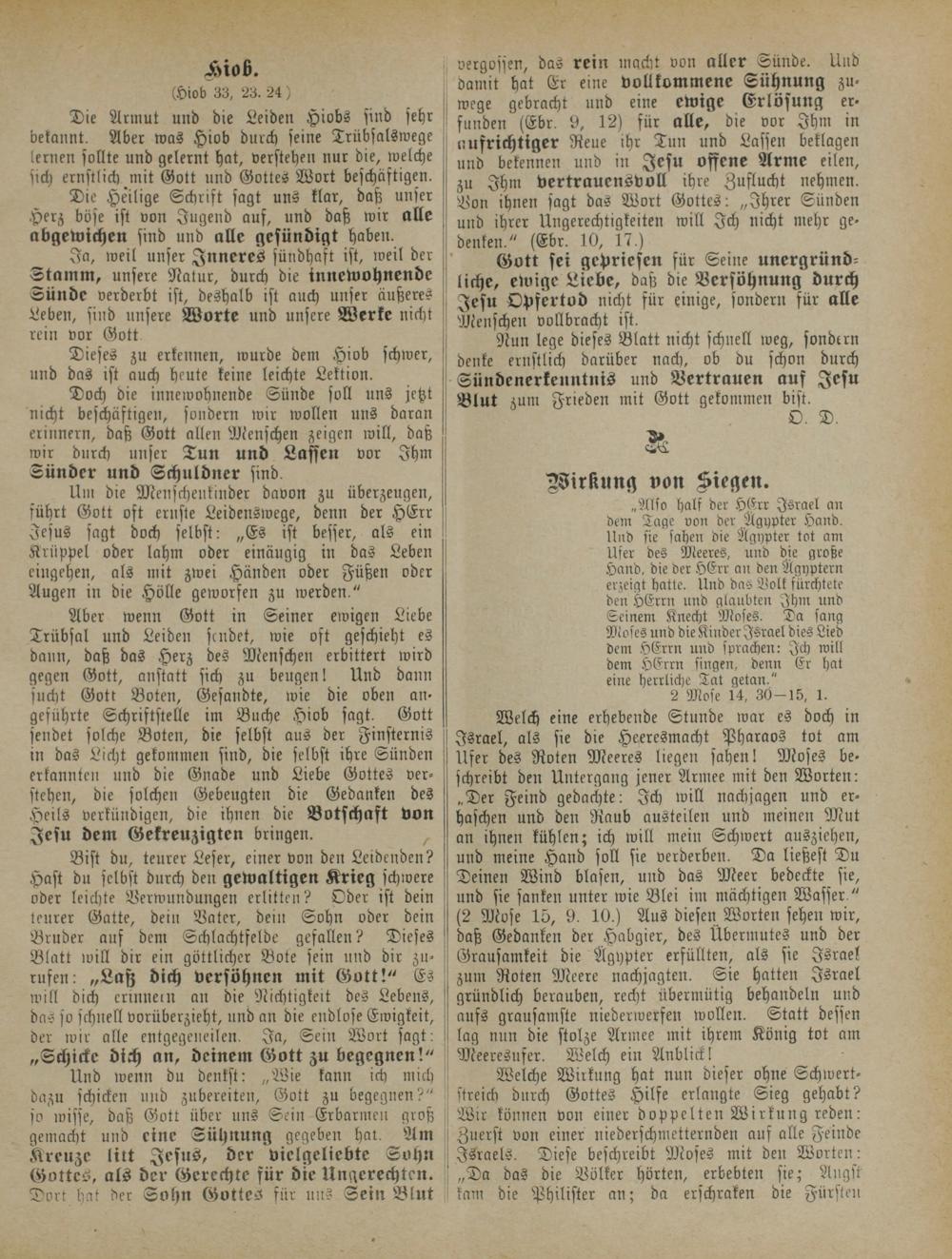 Bist du, teurer Leser, einer von den Leidenden? Hast du selbst durch den gewaltigen Krieg schwere oder leichte Verwundungen erlitten? Oder ist dein teurer Gatte, dein Vater, dein Sohn oder dein Bruder auf dem Schlachtfelde gefallen? Dieses Blatt will dir ein göttlicher Bote sein und dir Zurufen: „Latz dich versöhnen mit Gott!" Es will dich erinnern an die Nichtigkeit des Lebens, das so schnell vorüberzieht, und an die endlose Ewigkeit, der wir alle cntgegeneilen. Ja, Sein Wort sagt: „Schicke dich an, deinem Gott zu begegnen!"