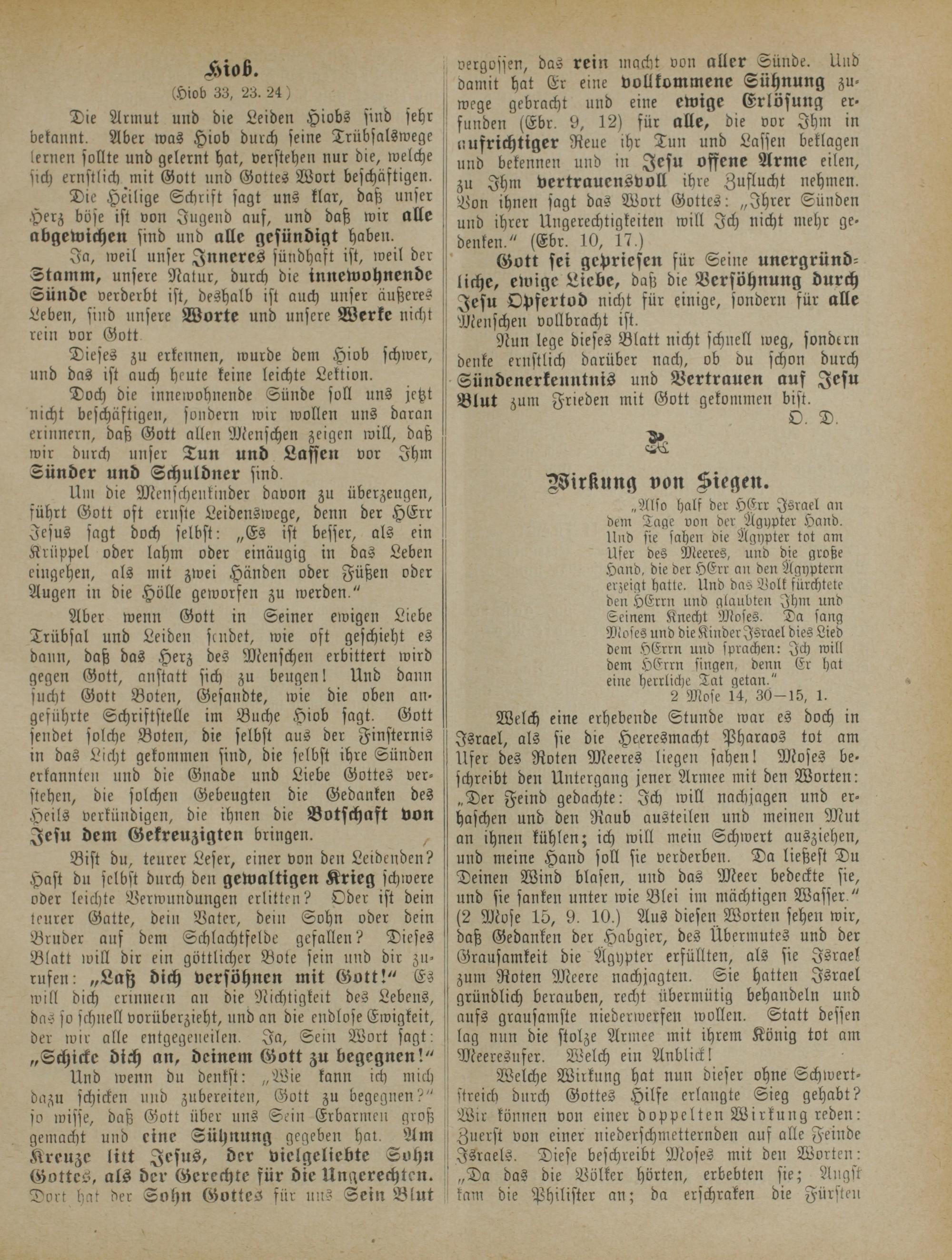 Aber wenn Gott in Seiner ewigen Liebe Trübsal und Leiden sendet, wie oft geschieht es dann, daß das Herz des Menschen erbittert wird gegen Gott, anstatt sich zu beugen! Und dann jucht Gott Boten, Gesandte, wie die oben angeführte Schriftftelle im Buche Hiob sagt. Gott sendet solche Boten, die selbst aus der Finsternis in das Licht gekommen sind, die selbst ihre Sünden erkannten und die Gnade und Liebe Gottes verstehen, die solchen Gebeugten die Gedanken des Heils verkündigen, die ihnen die Botschaft von Jesu dem Gekreuzigten bringen.