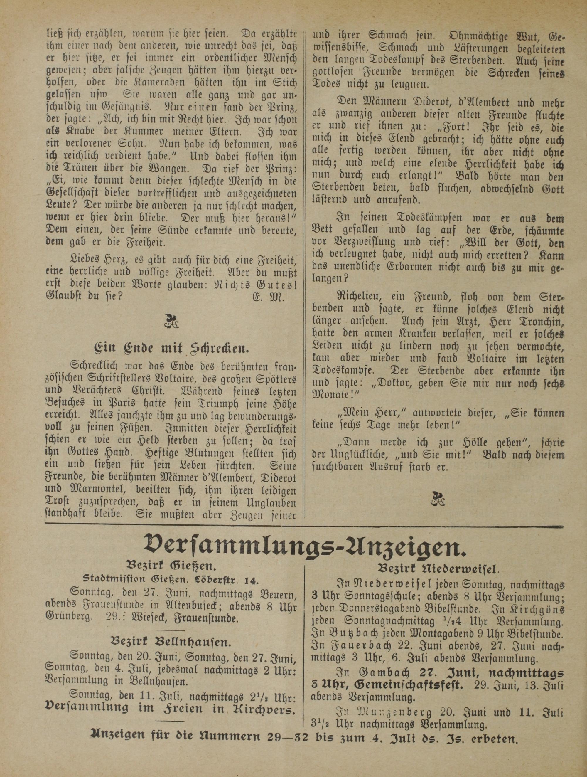 In Niederweisel jeden Sonntag, nachmittags 3 Uhr Sonntagsjchule; abends 8 Uhr Versammlung; jeden Donnerstagabend Bibelstunde. In Kirchgöns jeden Sonntagnachmittag V«4 Uhr Versammlung. In Butzbach jeden Montagabend 9 Uhr Bibelstunde. In Fauerbach 22. Juni abends, 27. Juni nachmittags 3 Uhr, 6. Jul, abends Versammlung.