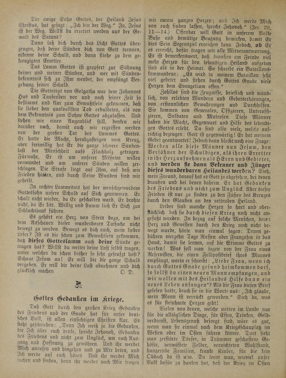 Zahllos sind die Zeugnisse, brieflich und münd- lich, von erlebten Wundern und Gebetserhörungen, von erstaunlichen Bewahrungen und Durchhilfen. Sie kommen von Generalen, Offizieren, Unteroffi. zieren, Soldaten und Matrosen. Diese Männer haben die Macht, Gegenwart und Hilfe des lebendigen Gottes erlebt. Da sind also viele, welche auf. richtig bezeugen: Gott ist gegenwärtig! Er hat meinem Gebet geantwortet! Jedoch dann bleibt noch eine Frage: Werden alle diese Männer nun Jesum, den Versöhner der Schuldigen, als ihren Erretter in ihr Herz aufnehmen als HErrn und Gebieter, und werden fie dann Bekenner und Jünger dieses wunderbaren Heilandes werden? Sieh, mein Freund, darauf hat es Gott ja abgesehen, bei denen draußen und bei denen daheim. Er'hat Gedanken des Friedens und nicht zum Unglück. Aber dieser Frieden ist nur zu finden zu den Füßen des Kreuzes durch den Glauben an den rettenden Heiland.