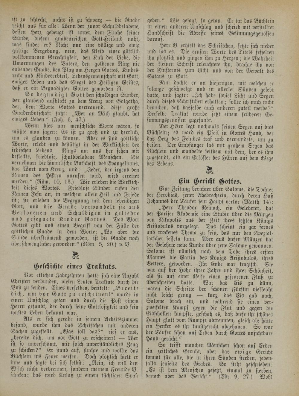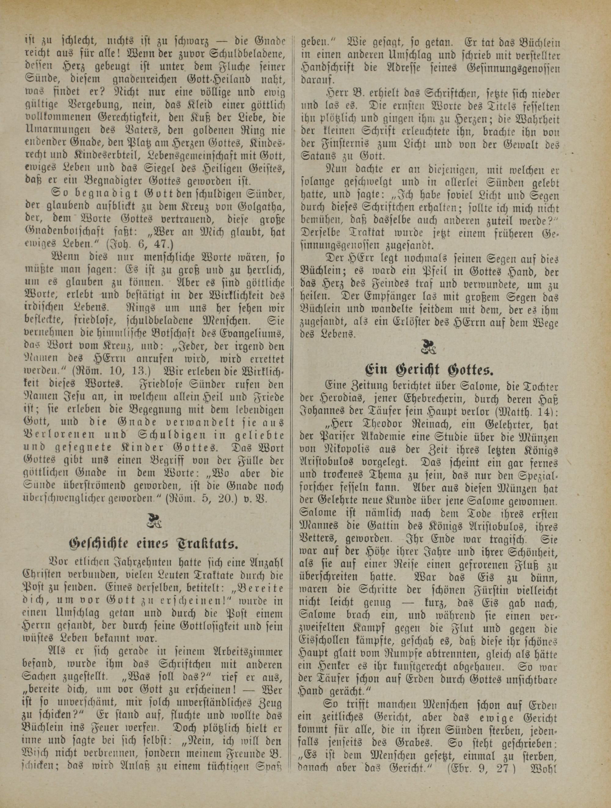 „Herr Theodor Reinach, ein Gelehrter, hat der Pariser Akademie eine Studie über die Münzen von Nikopolis aus der Zeit ihres letzten Königs Aristobulos vorgelegt. Das scheint ein gar fernes und trockenes Thema zu sein, das nur den Spezialforscher fesseln kann. Aber aus diesen Münzen hat der Gelehrte neue Kunde über jene Salome gewonnen. Salome ist nämlich nach dem Tode ihres ersten Mannes die Gattin des Königs Aristobulos, ihres Vetters, geworden. Ihr Ende war tragisch. Sie war auf der Höhe ihrer Jahre und ihrer Schönheit, als sie auf einer Reise einen gefrorenen Fluß zu überschreiten hatte. War das Eis zu dünn, waren die Schritte der schönen Fürstin vielleicht nicht leicht genug — kurz, das Eis gab nach, Salome brach ein, und während sie einen verzweifelten Kampf gegen die Flut und gegen die Eisschollen kämpfte, geschah es, daß diese ihr schönes Haupt glatt vom Rumpfe abtrennten, gleich als hätte ein Henker es ihr kunstgerecht abgehauen. So war der Täufer schon auf Erden durch Gottes unsichtbare Hand gerächt."