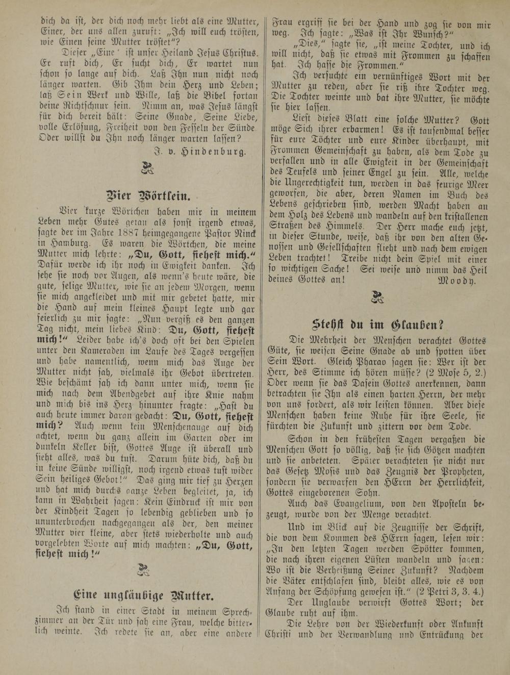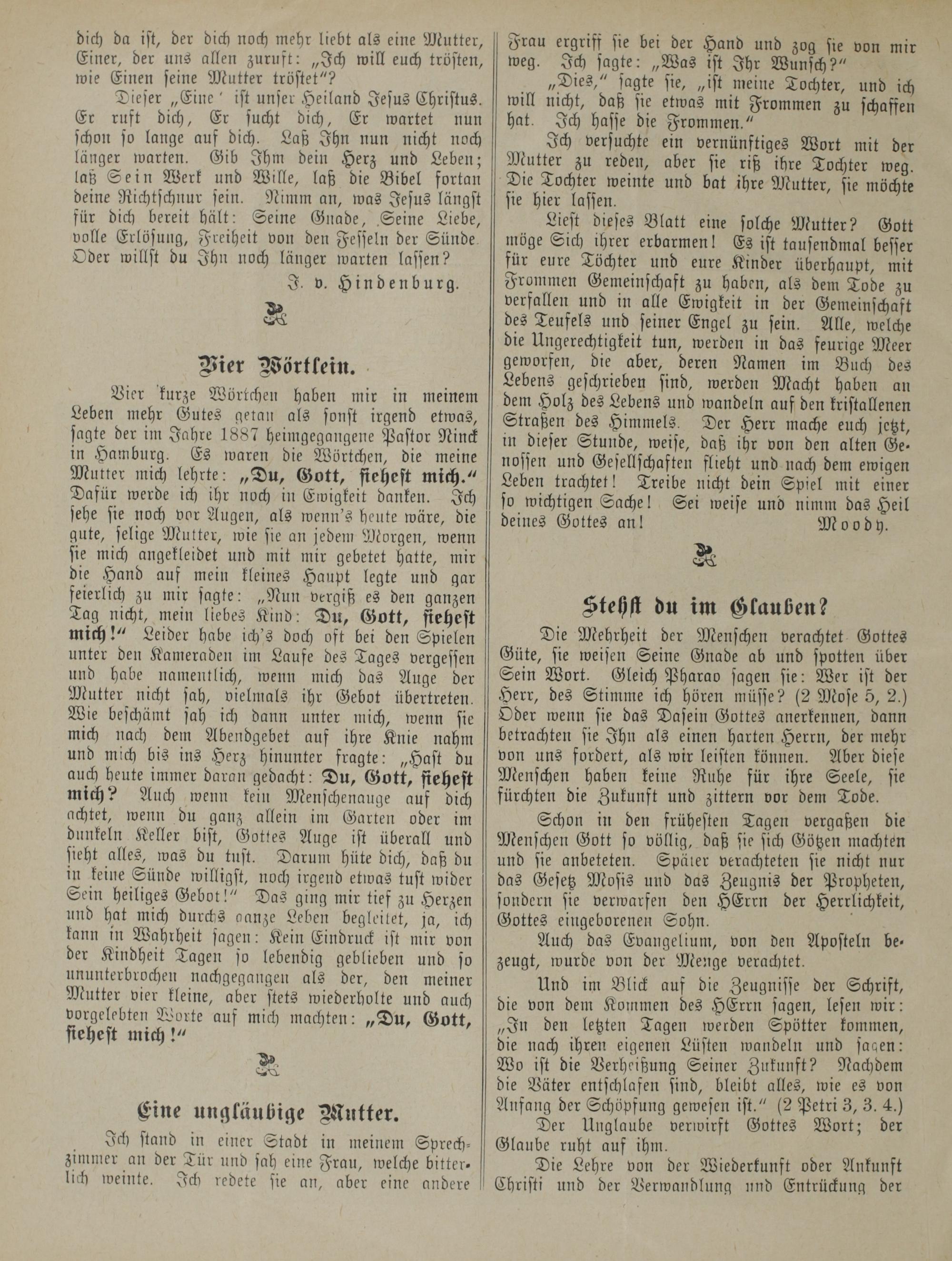 Bier kurze Wörtchen haben mir in meinem Leben mehr Gutes gelan als sonst irgend etwas, sagte der im Jahre 1887 Heimgegangene Pastor Ninck in Hamburg. Es waren die Wörtchen, die meine Mul,er mich lehrte: „Du, Gott, fiehest mich." Dafür werde ich ihr noch in Ewigkeit danken. Ich sehe sie noch vor Augen, als wenn's heute wäre, die gute, selige Mutter, wie sie an jedem Morgen, wenn sie mich angekleidet und mit mir gebetet hatte, mir die Hand auf mein kleines Haupt legte und gar feierlich zu mir sagte: „Nun vergiß es den ganzen Tag nicht, mein liebes Kind: Du, Gott, fiehest mich!" Leider habe ich's doch oft bei den Spielen unter den Kameraden im Laufe des Tages vergessen und habe namentlich, wenn mich das Auge der Mutter nicht sah, vielmals ihr Gebot übertreten. Wie beschämt sah ich dann unter mich, wenn sie mich nach dem Abendgebet auf ihre Knie nahm und mich bis ins Herz hinunter fragte: „Hast du auch heute immer daran gedacht: Du, Gott, fiehest mich? Auch wenn kein Menschenauge auf dich achtet, wenn du ganz allein im Garten oder im dunkeln Keller bist, Gottes Auge ist überall und sieht alles, was du tust. Darum hüte dich, daß du in keine Sünde willigst, noch irgend etwas tust wider Sein heiliges Gebot!" Das ging mir tief zu Herzen und hat mich durchs aanze Leben begleitet, ja, ich kann in Wahrheit sagen: Kein Eindruck ist mir von der Kindheit Tagen so lebendig geblieben und so ununterbrochen nachgegangen als der, den meiner Mutter vier kleine, aber stets wiederholte und auch vorgelebten Worte auf mich machten: „Du, Gott, fiehest mich!"