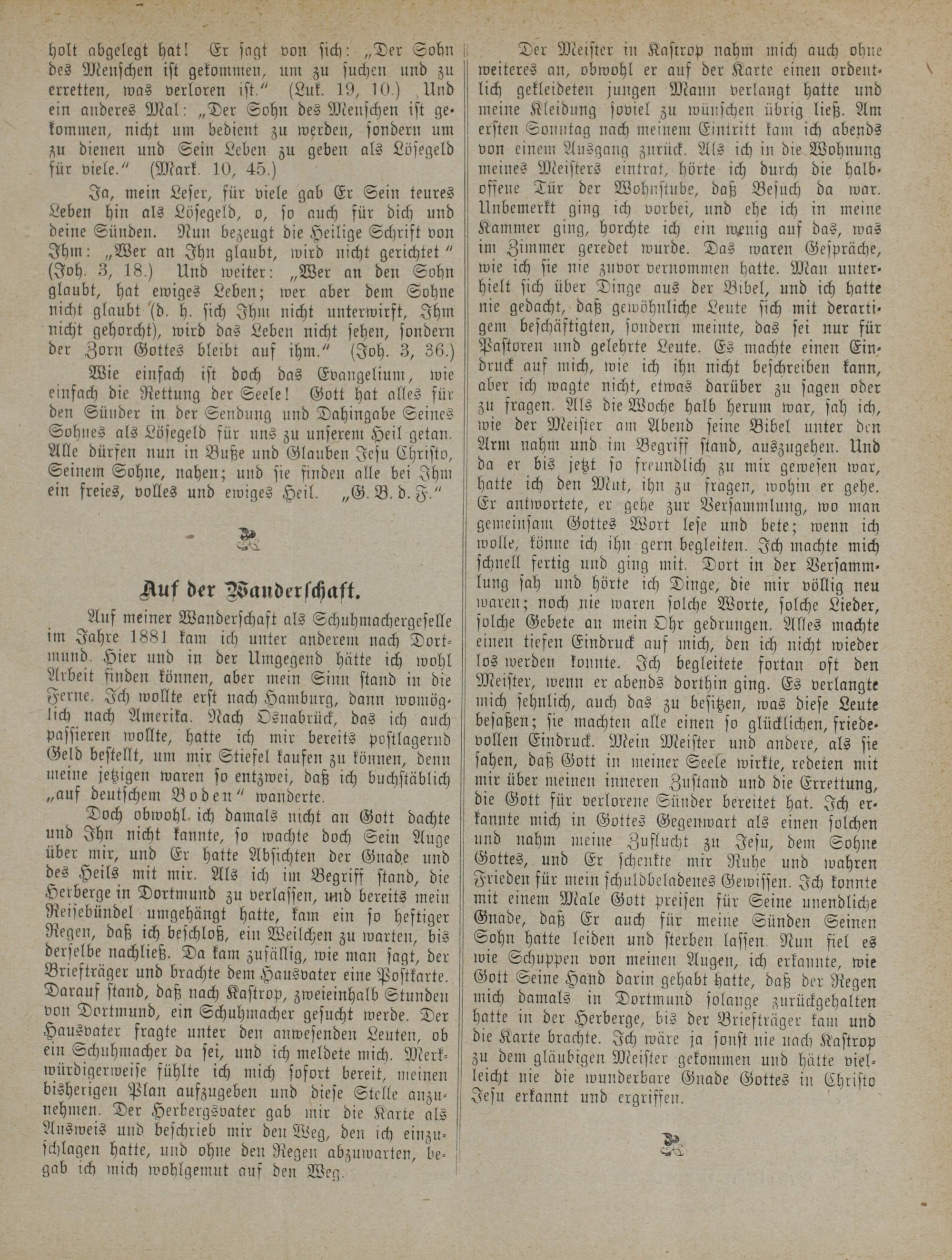 Doch obwohl ich damals nicht an Gott dachte und Ihn nicht kannte, so wachte doch Sein Auge über mir, und Er hatte Absichten der Gnade und des Heils mit mir. Als ich im Begriff stand, die Herberge in Dortmund zu verlassen, und bereits mein Reisebüudel umgehängt hatte, kam ein so heftiger Regen, daß ich beschloß, ein Weilchen zu warten, bis derselbe nachließ. Da kam zufällig, wie man sagt, der Briefträger und brachte dem Hausvater eine Postkarte. Darauf stand, daß nach Kastrop, zweieinhalb Stunden von Dortmund, ein Schuhmacher gesucht werde. Der Hausvater fragte unter den anwesenden Leuten, ob ein Schuhmacher da sei, und ich meldete mich. Merkwürdigerweise fühlte ich mich sofort bereit, meinen bisherigen Plan aufzugeben und diese Stelle anzu- ! nehmen. Der Herbergsvater gab mir die Karte als Ausweis und beschrieb mir den Weg, den ich einzu- schlagen hatte, und ohne den Regen abzuwarten, begab ich mich wohlgemut auf den Weg.