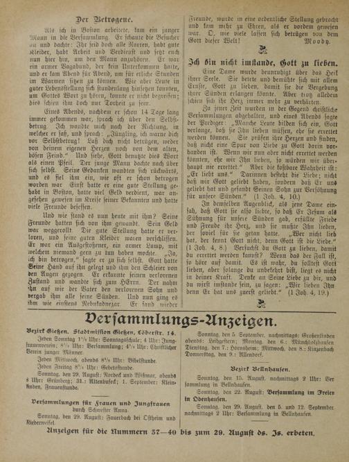 Sonntag, den 29. August, den 5. und 12. September, nachmittags 2 Uhr: Versammlung in Bellnhausen.