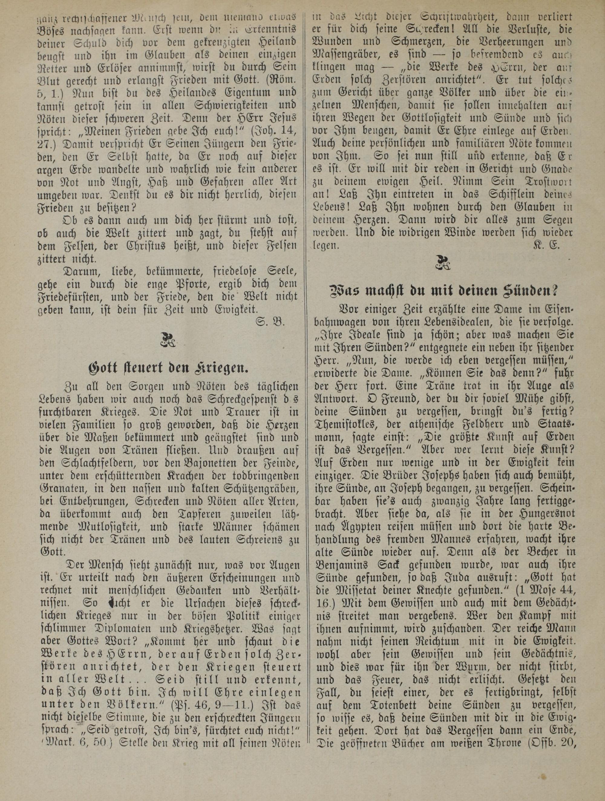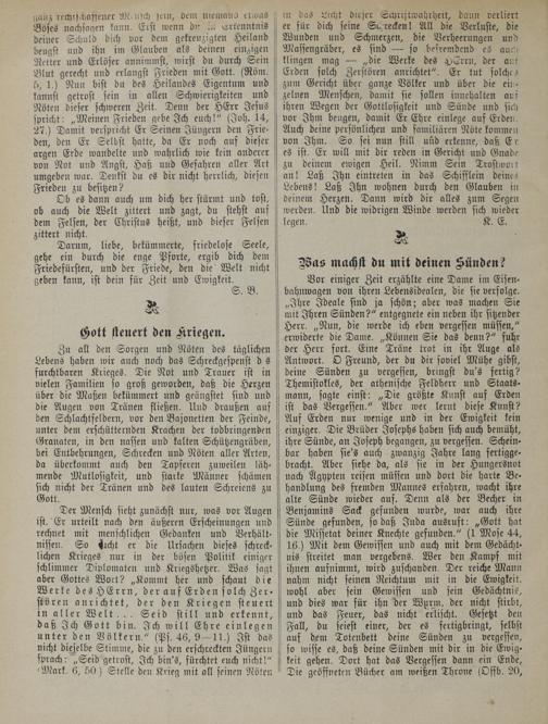 Zu all den Sorgen und Nöten des täglichen Lebens haben wir auch noch das Schreckgespenst d s furchtbaren Krieges. Die Not und Trauer ist in vielen Familien so groß geworden, daß die Herzen über die Maßen bekümmert und geängstet sind und die Augen von Tränen fließen. Und draußen auf den Schlachtfeldern, vor den Bajonetten der Feinde, unter dem erschütternden Krachen der todbringenden Granaten, in den nassen und kalten Schützengräben, bei Entbehrungen, Schrecken und Nöten aller Arten, da überkommt auch den Tapferen zuweilen lähmende Mutlosigkeit, und starke Männer schämen sich nicht der Tränen und des lauten Schreiens zu Gott.
