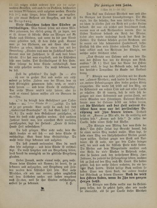„Die Königin vom Mittag kam vom Ende der Erde." Der HErr Jesus legt Gewicht darauf, daß sie einen weiten Weg machen mußte. Man sagt, sie habe einen Weg von fünfzehnhundert Meilen zurück- legen müssen. Solches zeugte von Ernst und Ausdauer. Es ist wahr, wer gar kein Opfer bringen will, der wird auch die köstliche Perle nicht finden Die Weisen aus dem Morgenlande machten auch eine Reise, die viele Wochen in Anspruch nahm, aber sie fanden auch den verheißenen König. Zwei Indianer, die jenseits der Felsengebirge lebten, machten sich zu Fuß auf den Weg nach St. Louis. Sie hatten gehört, daß hier weiße Lehrer wohnten, die ein heiliges Buch hätten. Dieses heilige Buch wollten sie haben. Einer von ihnen starb, der andere brachte das Bibelbuch zu seinem Stamme Auch du wirst den HErrn finden, wenn du Ihn von ganzem Herzen suchst.