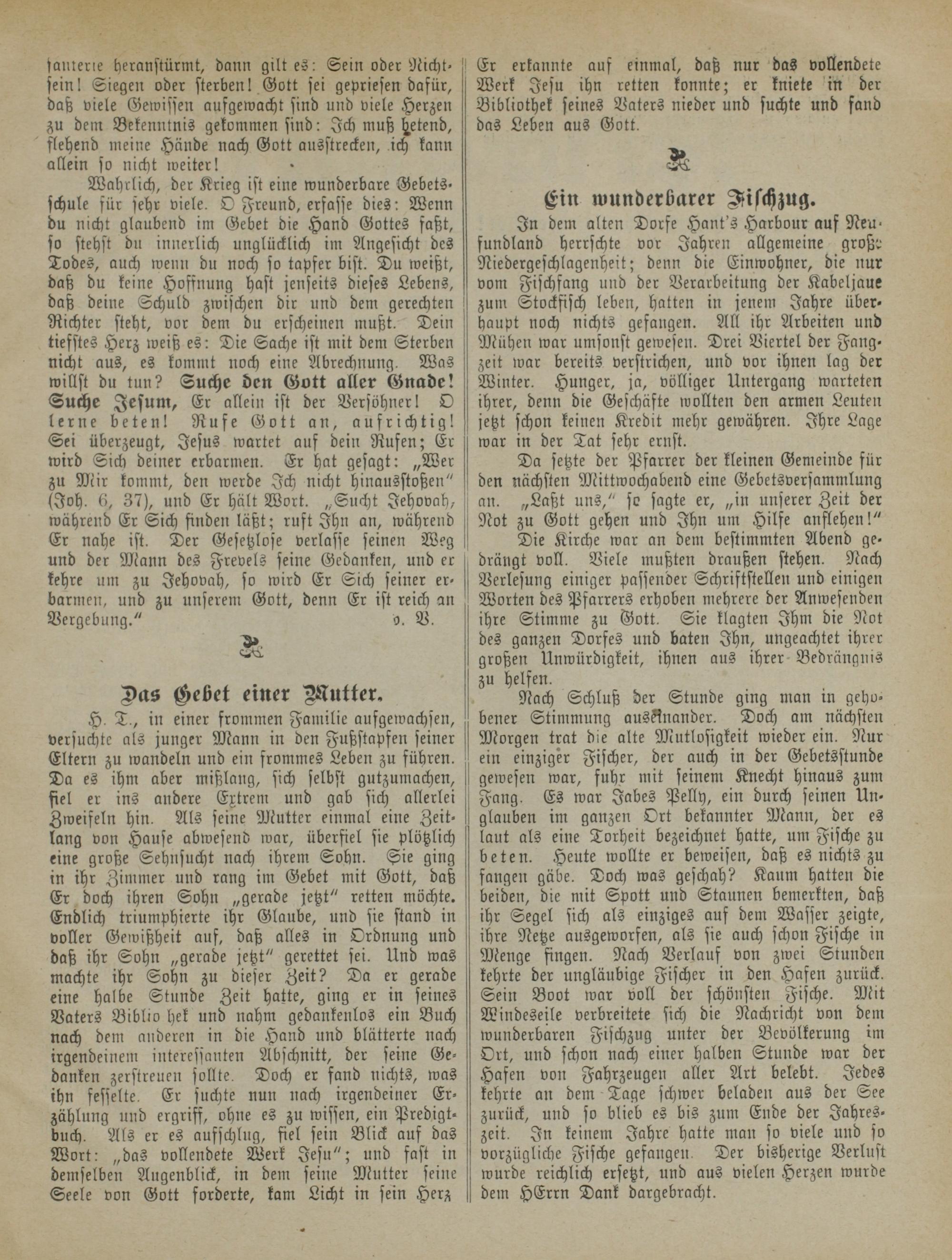 Nach Schluß der Stunde ging man in gehobener Stimmung auseinander. Doch am nächsten Morgen trat die alte Mutlosigkeit wieder ein. Nur ein einziger Fischer, der auch in der Gebetsstunde gewesen war, fuhr mit seinem Knecht hinaus zum Fang. Es war Jabes Pelly, ein durch seinen Un- glauben im ganzen Ort bekannter Mann, der es laut als eine Torheit bezeichnet hatte, um Fische zu beten. Heute wollte er beweisen, daß es nichts zu fange» gäbe. Doch was geschah? Kaum hatten die beiden, die mit Spott und Staunen bemerkten, daß ihr Segel sich als einziges auf dem Wasser zeigte, ihre Netze ausgeworfen, als sie auch schon Fische in Menge fingen. Nach Verlauf von zwei Stunden kehrte der ungläubige Fischer in den Hafen zurück. Sein Boot war voll der schönsten Fische. Mit Windeseile verbreitete sich die Nachricht von dem wunderbaren Fischzug unter der Bevölkerung im Ort, und schon nach einer halben Stunde war der Hafen von Fahrzeugen aller Art belebt. Jedes kehrte an dem Tage schwer beladen aus der See zurück, und so blieb es bis zum Ende der Jahreszeit. In keinem Jahre hatte man so viele und so vorzügliche Fische gefaugeu. Der bisherige Verlust wurde reichlich ersetzt, und aus vielen Herzen wurde dem HErrn Dank dargebracht.