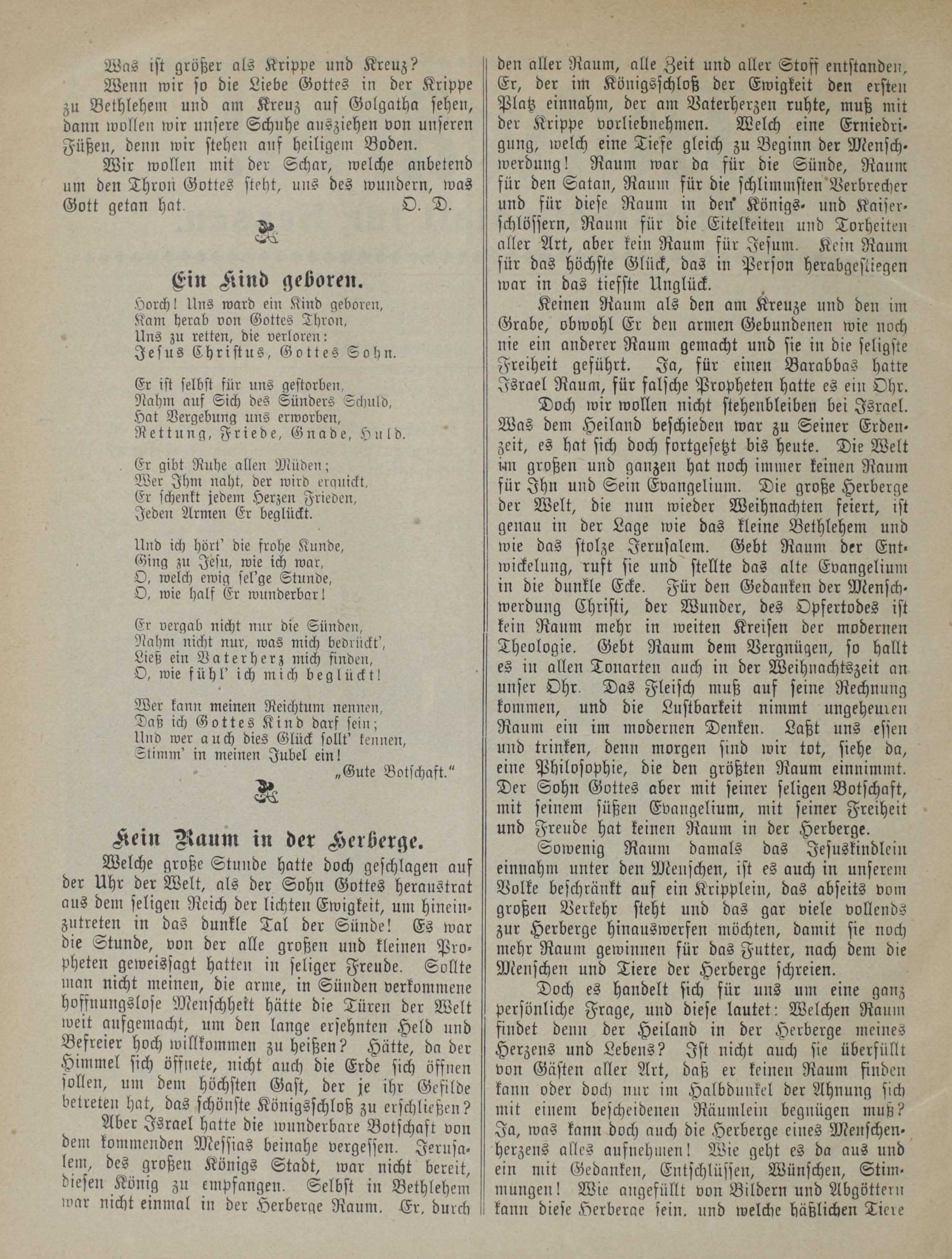 Sowenig Raum damals das Jesuskindlein einnahm unter den Menschen, ist es auch in unserem Volke beschränkt auf ein Kripplein, das abseits vom großen Verkehr steht und das gar viele vollends zur Herberge hinauswerfen möchten, damit sie noch mehr Raum gewinnen für das Futter, nach dem die Menschen und Tiere der Herberge schreien.