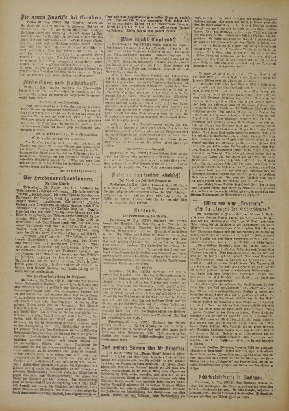 Der Milttärtrittker des „Derner DuNd* betont in seinem Rückblick 1917. daß auch dieses Iahe abermals mit einem klaren strategischen Ergebnis ende, das sich politisch in der völligen Zersetzung des Krieges im Osten vusdrückte. Zur Frage ..Fort- schurr« oder Abbrach des Krieger" schreibt «: „Es wäre ver- messen, r^rauszuscrgen. ob der blutige Krieg einer allgemeinen Verständigung Platz mache, verwesen. weil über die' in den Krug eingetretenc Macht der Vereinigten Slta&fen noch keine Sicherheit beitebt. obwohl man «mrebmen dass der psycho- kagllche Augenblick gekommen sei. tu «eiche« Präsident Wilson als Vertreter der außereuropäischen trüm'i-chrenöea Vormacht die Initiative zur Herbeiführung der Weltfriedens ergreifen Iynnte._ Kommt wc dem Frühjahr keine Verständigung zu-