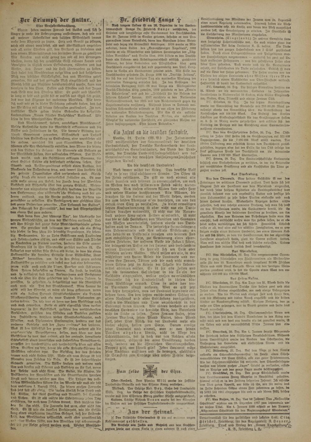 Berlin, 31. Dezbr. (W. 53.) Zur Jahreswende 1917 veröffentlichen der Kriegsausschuß der deutschen Landwirtschaft, der Deutsche Neichsverband der landwirtschaftlichen Genossenschaften, der Bund der Land--, wirte, die Deutsche Land airtschastsgesellscha'l und der Eeneralverband der deutschen Naiffeffengenoffeiffchaflen folgenden Au'ruf: