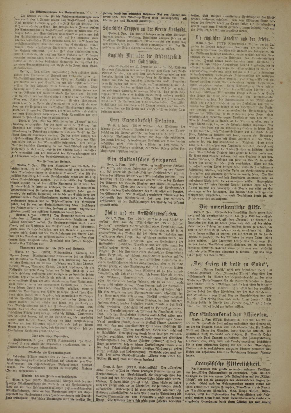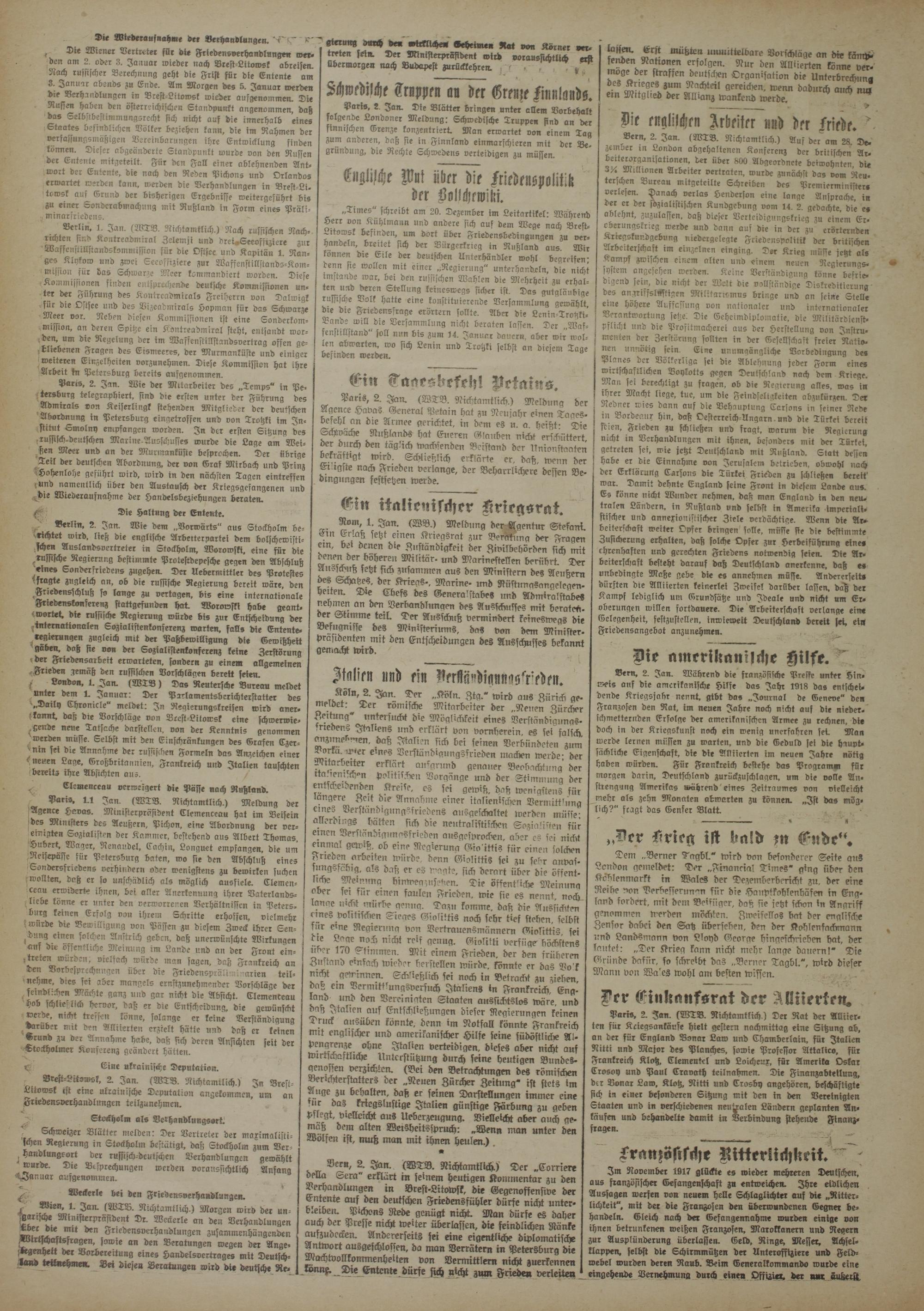 Die Wiederaufnahme der Verhandlungen. ‘T'fT K' f Die Wiener Vertreter für dte Frledensverhandlunge« werden am 2. oder 3. Januar wieder nach Vrest-Litowsk abreisen. Nach russischer Berechnung geht die Frist für die Entente am S. Januar abends zu Ende. Am Morgen des 5. Januar werden bie Verhandlungen in Vrest-Litowsk wieder ausgenommen. Die Nusien haben den österreichischen Standpunkt angenommen, daß das Selbstbestimmungsrecht sich nicht auf die innerhalb eines Staates befindlichen Völker beziehen kann, die im Rahmen der verfassungsmäßigen Vereinbarungen ihre Entwicklung finden können. Dieser abgeänderte Standpunkt wurde von den Russen der Entente mitgeteilt. Für den Fall einer ablehnenden Antwort der Entente, die nach den Reden Pichons und Orlandos erwartet werden kann, werden die Verhandlungen in Brest-Li. towsk auf Grund der bisherigen Ergebnisse weitergeführt bis zu einer Sondcrabmachung mit Rußland in Form eines Präliminarfriedens.