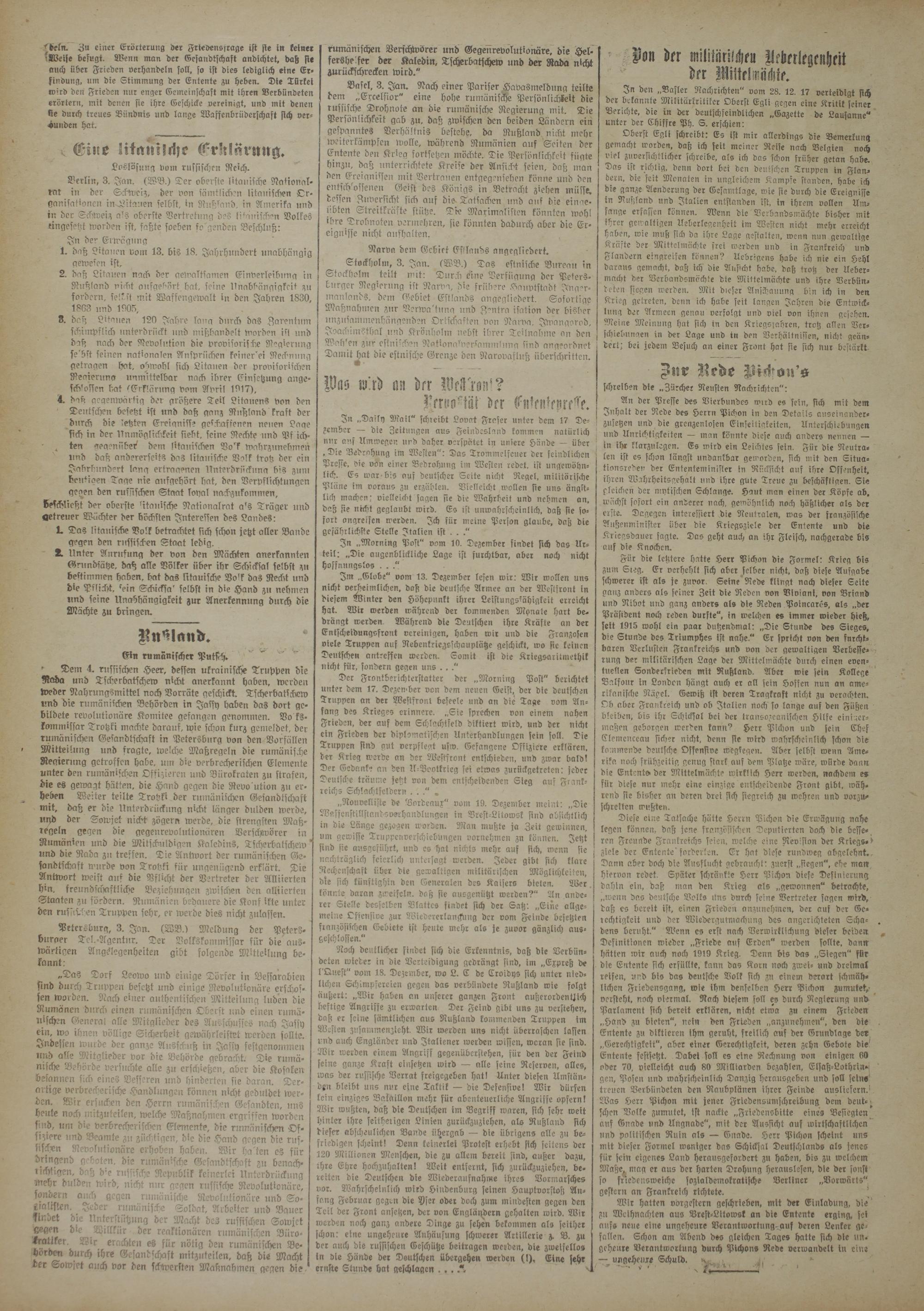 Wir hatten vorgestern geschrieben, mit der Einladung, die zu Weihnachten aus Brest-Litowsk an die Entente erging, fei aufs neue eine ungeheure Verantwortungauf deren Lenker gefallen. Schon am Abend dss gleichen Tages hatte sich die un. geheure Verantwortung durch Pichons Rede verwandelt in eins — ungeheure Schuld. j.
