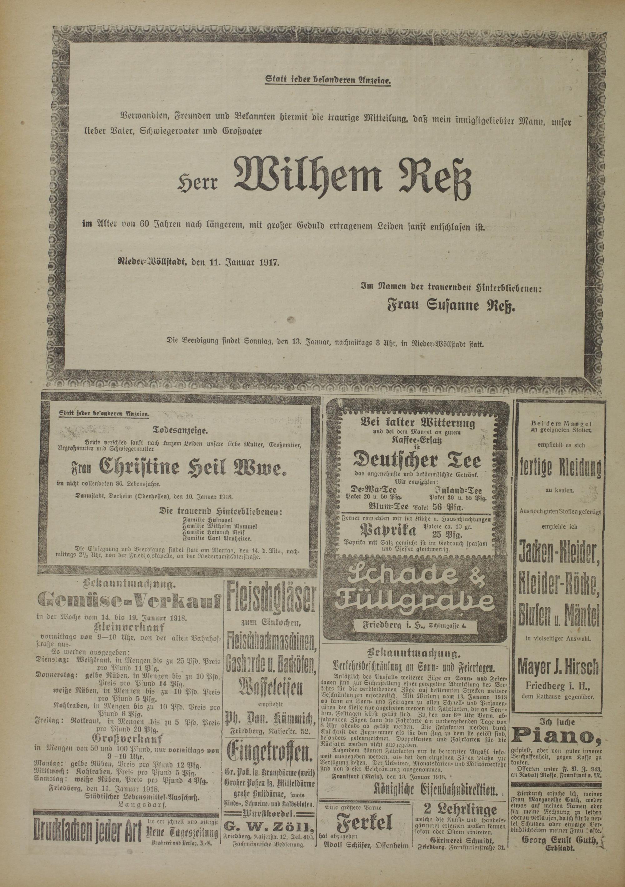 Die Beerdigung findet Sonntag, den II. Januar, nachmittags 3 Uhr, in Nieder-Wöllstadt statt.