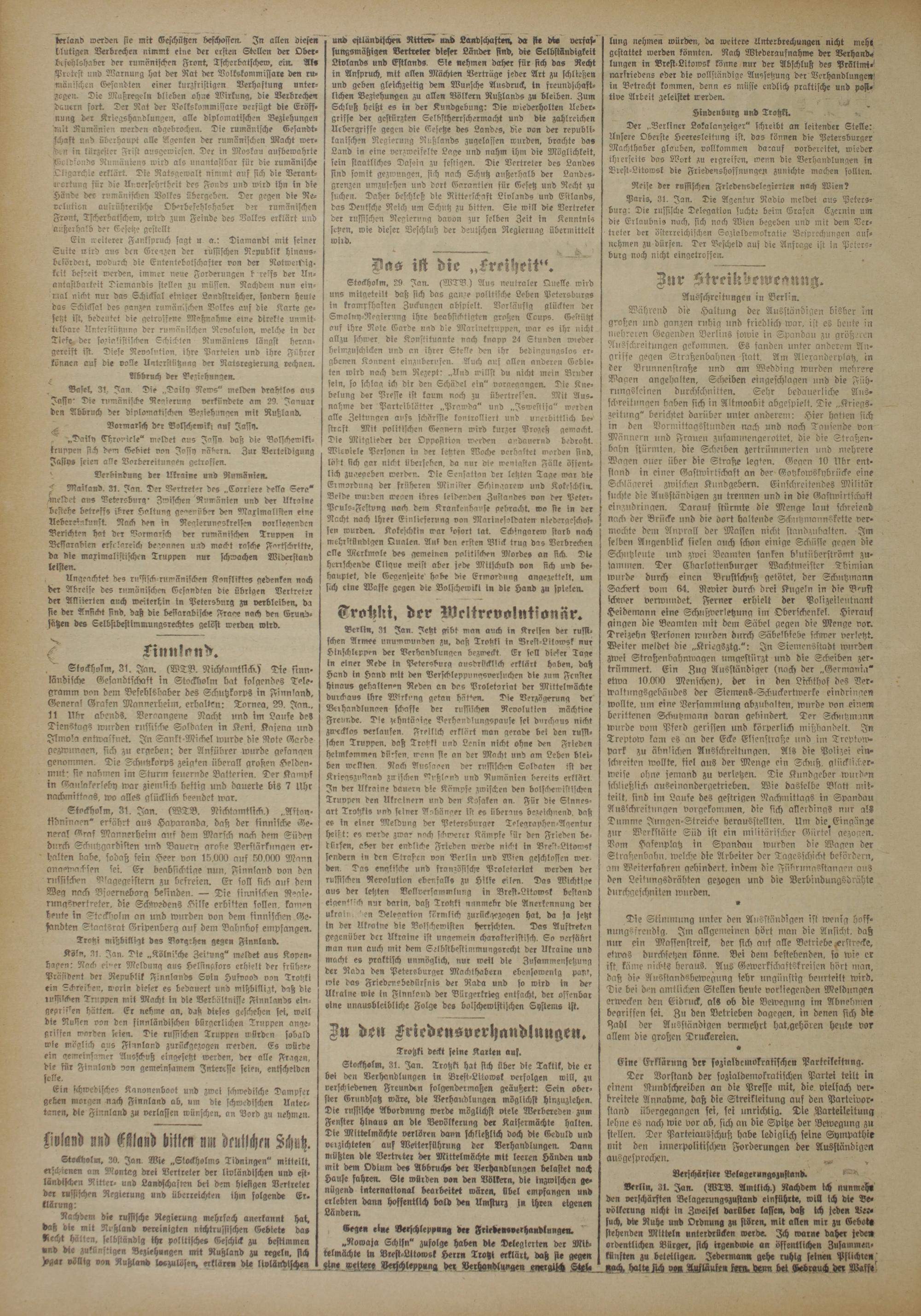 Berlin, 31 Jan. Jetzt gibt man auch in Kreisen der russischen Armee unumwunden zu. daß Trotzki in Bresi-Litowsk nur Hinfchleppen der Verhandlungen bezweckt. Er soll dieser Tage in einer Rede in Petersburg ausdrücklich erklärt haben, daß Hand in Hand mit den Verschleppungsversuchen die zum Fenster hinaus gebalten-n Reden an das Proletariat der Mittelmächte durchaus ihre Wirkung getan hätten. Die Verzögerung der Verhandlungen schaffe der russischen Revolution mächtioe Freunde. Die zchntäoige Verhandlungspause sei durchaus nicht zv'ecklos verlaufen. Freilich erklärt man gerade bei den russischen Truppen, daß Trotzki und Lenin nicht ohne den Frieden heimkommen dürfen, wenn sie an der Macht und am Leben bleiben wollten. Nach Aussaoen der russischen Soldaten ist der Kriegszustand zwischen Rußland und Rumänien bereits erklärt. In der Ukraine dauern die Kämpfe zwischen den bolscknwislischen Truvpen den Ukrainern und den Kosaken an. Für die Sinnesart Trotzkis und seiner Anhänger ist es überaus bezeichnend, daß es in einer Meldung der Petersburger Telegraphen-Agentur heißt: es werde zwar noch schwerer Kämpfe lür den Frieden bedürfen, aber der endliche Frieden werde nicht in Brest-Litowsk sondern in drn Straßen von Berlin und Wien geschloffen werden. Das englische und französische Proletariat werden der russischen Revolution ebenfalls zu Hilfe eilen. Das Wichtige aus der letzten Vollversammlung in Bresi-Litowsk bestand eigentlich nur darin, daß Trotzki nunmebr die Anerkennung der ukro'n en Deleoation förmlich zurück,gezogen hat. da ja jetzt in der Ukraine die Bolschewisten herrschten. Das Auftreten gegenüber der Ukraine ist ungemein charakteristisch. So verfahrt man nun auch mit dem Selbstbestinimungsrccht der Ukraine und macht es praktisch unmöglich, nur weil die Zusammensetzung der Rada den Petersburger Machthabern ebensowenig paw, wie das Friedensbedilrfnis der Rada und so wird in der Ukraine wie in Finnland der Bürgerkrieg entfacht, der offenbar eine unausbleibliche Folge des bolschewistischen Systems ist.