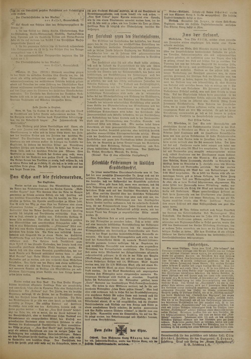 Verantwortlich für den politischen und lokalen Teil: Ltto H t r f ch e l, Friedberg: für den Anzeigenteil: R. H e y n e r, Friedberg. Druck und Verlag der „Neuen Tageszeitung*. A- ftriebbera l ,Cv ' " '